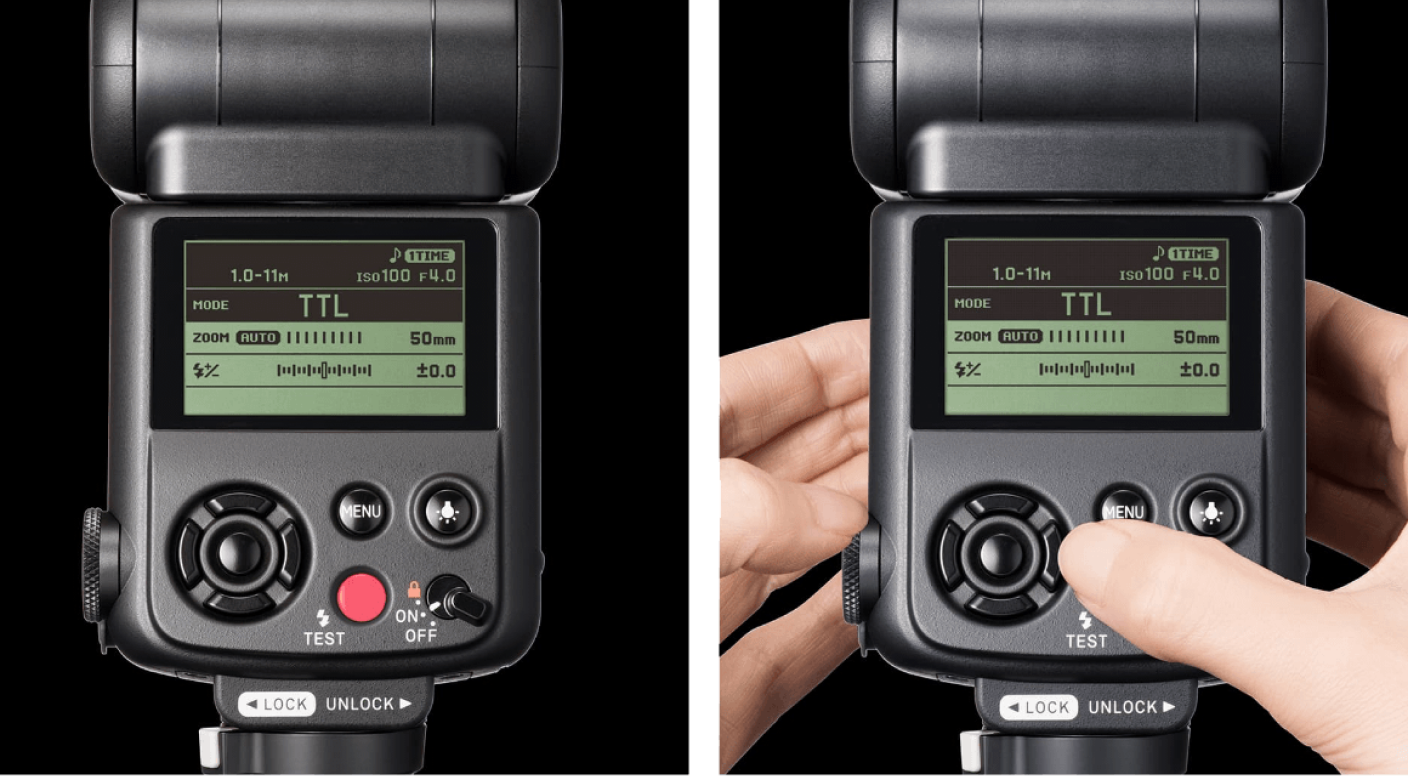 The new dot matrix liquid crystal display is incorporated for this flash. Moreover, the D-Pad and dial on the side of the flashgun make changing settings, such as TTL auto exposure system, wireless flash, FP flash and rear-curtain sync, on the main screen and setup menu displayed on the LCD easier than ever. The flash is designed to disengage easily by one-click on the shoe lock lever. In addition, a flash sync terminal and notification beep sound when the flashgun is fully charged improves ease of use. -