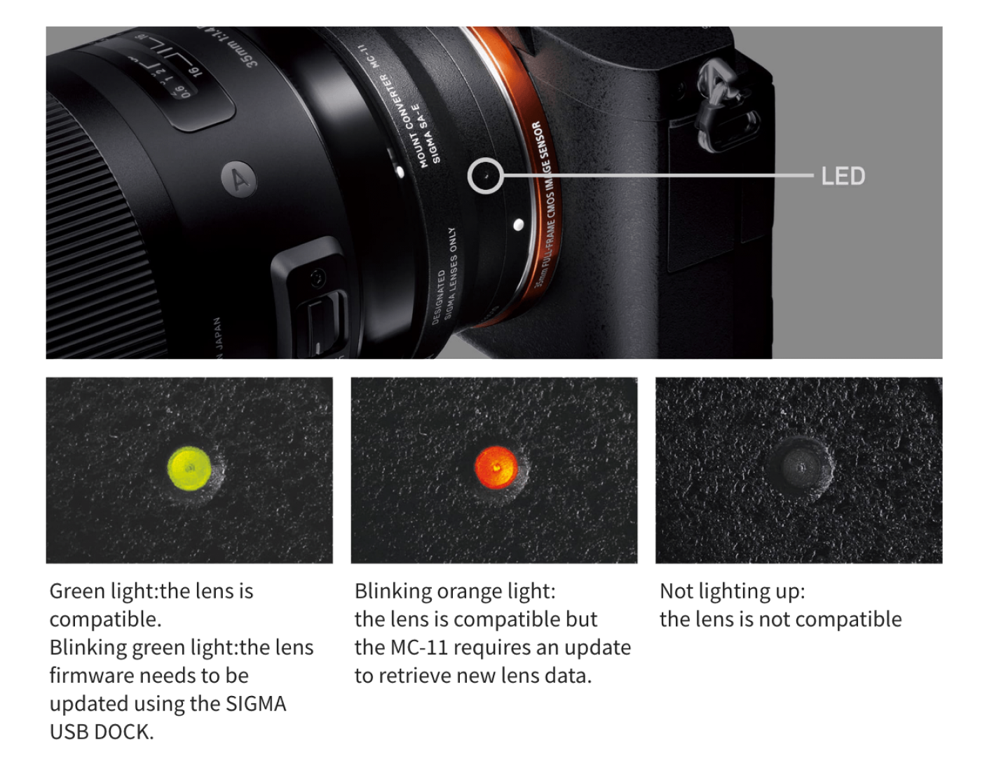The LED display on the MOUNT CONVERTER MC-11 makes it easy to know whether an attached lens is compatible or not and whether the mount converter control data needs to be updated for operation with that lens.
