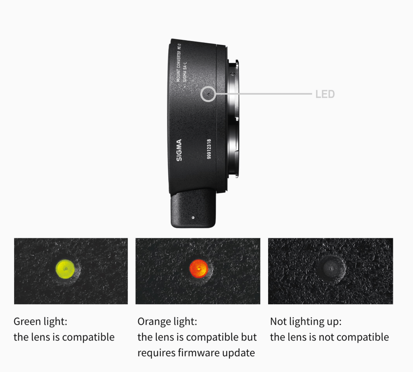 Whether the mounted lens is compatible or not is instantly visible from the color and the on/off of the MC-21’s built-in LED. The LED also notifies the user when a lens firmware update is available.