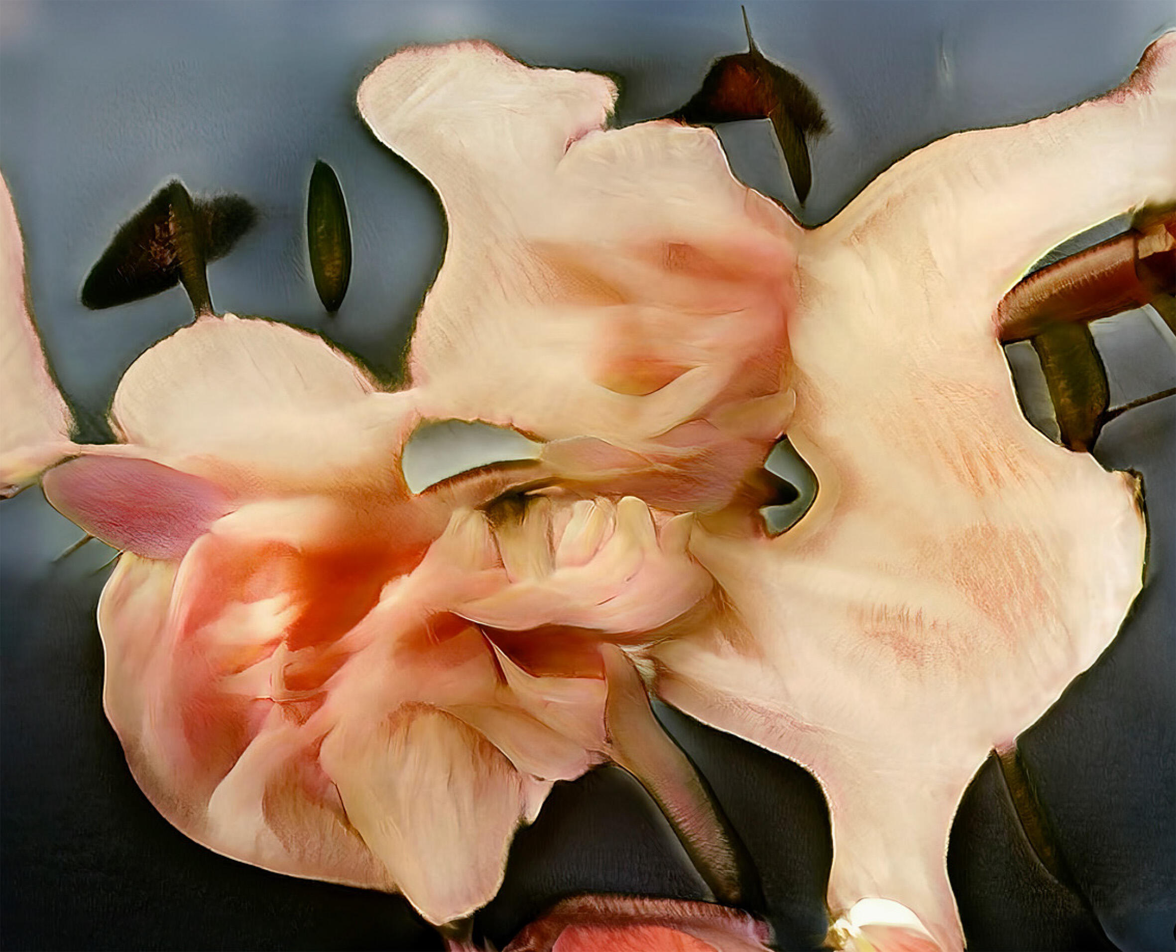 It's trained on my reality—my pictures—and it interprets them into its version, then I interpret what I like from that. It's very time-consuming, very slow, very cumbersome. You're deeply involved. That's what I loved about it. I find other AI much less interesting because new AI is made to fool you. This isn't made to fool you. This is obviously not real because it doesn't look real. It looks almost painted.