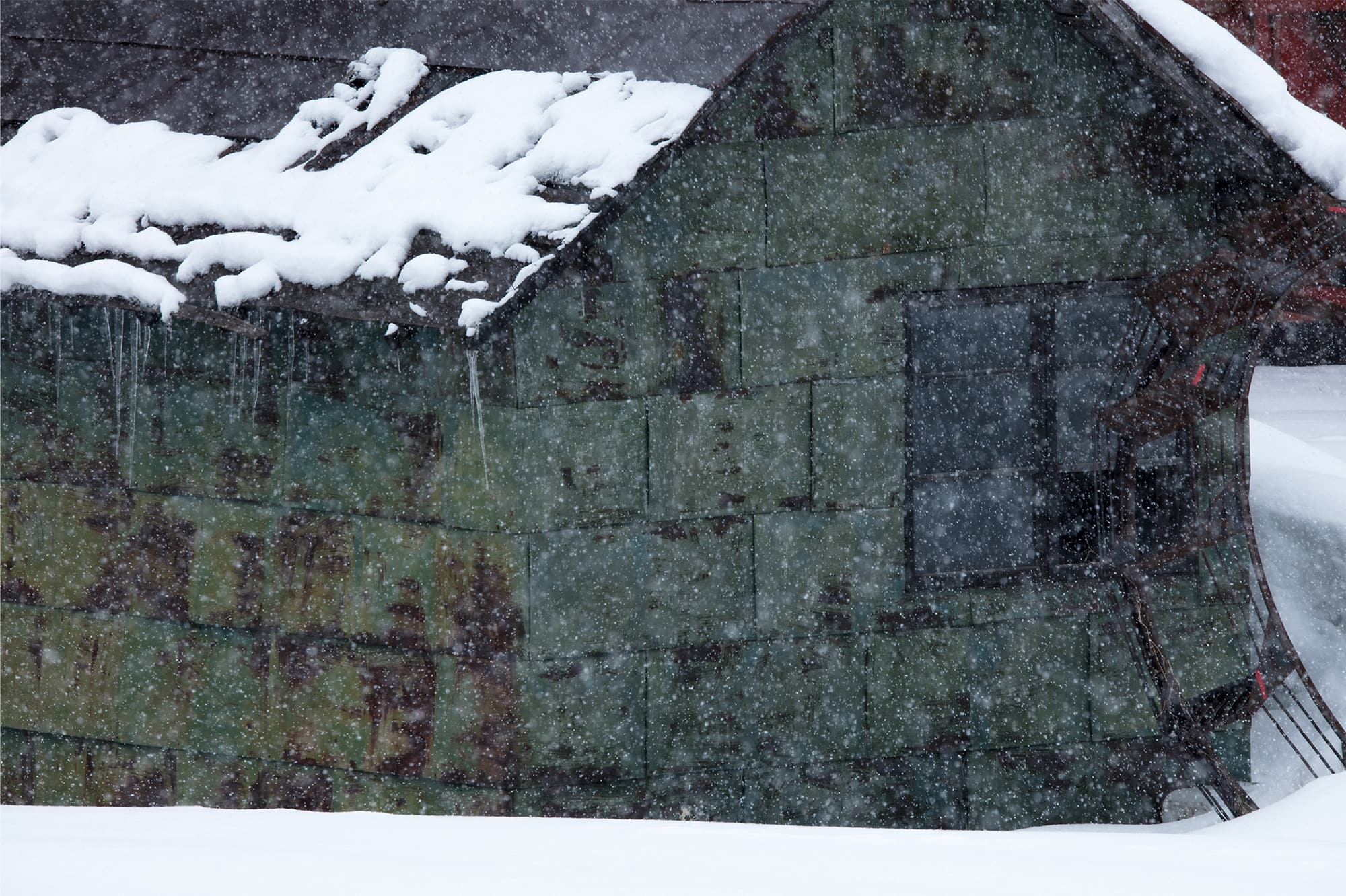 I looked for a black background to emphasize the snowstorm. I zoomed in to the deserted house and stopped it down to F11 to focus on the deserted house and the shape of the snow. Even at ISO 400, I ventured to use the shutter speed and focal length that may cause camera shake. Besides, the camera’s sensor has more than 50 megapixels. I wasn’t sure if I could freeze the falling snow, but the OS did a wonderful job.