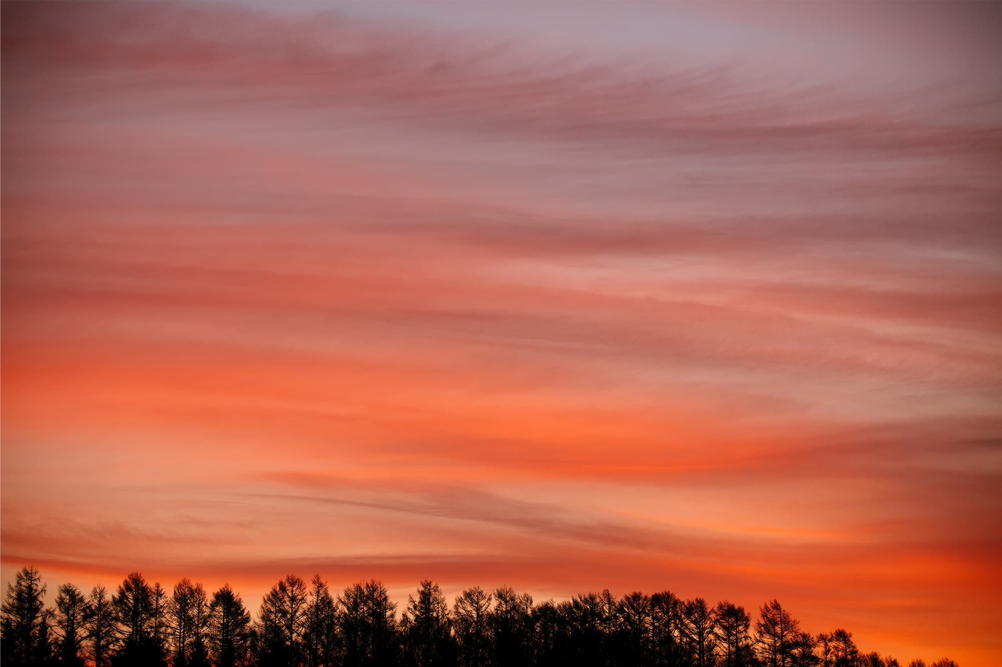 Spring approaches around mid-March in Japan, but the temperature was still minus 13 degrees in the early morning. The sky became red suddenly as the sun rose. The shapes of the clouds are interesting. You might not believe it, but it’s not easy to frame a line of trees. The key is how much we include or exclude horizontally, setting aside the issue of vertical inclusion. While with a prime lens I could use faster shutter speeds and enjoy high level of sharpness, the limitation of focal length becomes heavy fetters. This lens, light and compact for the focal length range, powerfully assists shooting landscapes.