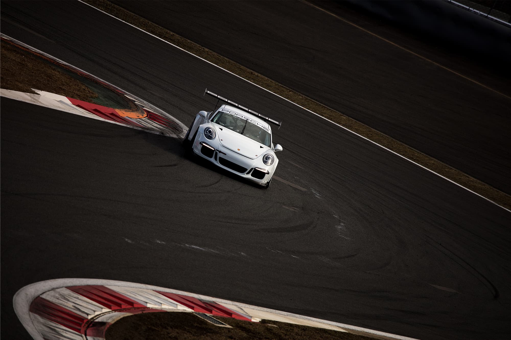 The angle of view of 400mm with no clipping forces me to give up taking close-ups and think about other ways of expressing. Because the Porsche 911 has the engine in the rear, the weight over the rear wheels is tremendous. So, when it accelerates to a maximum velocity at the exit of the corner, it looks like a fighter jet taking off from an aircraft carrier. It’s nothing but thrilling to see it lowering the rear and accelerating leaving black marks.