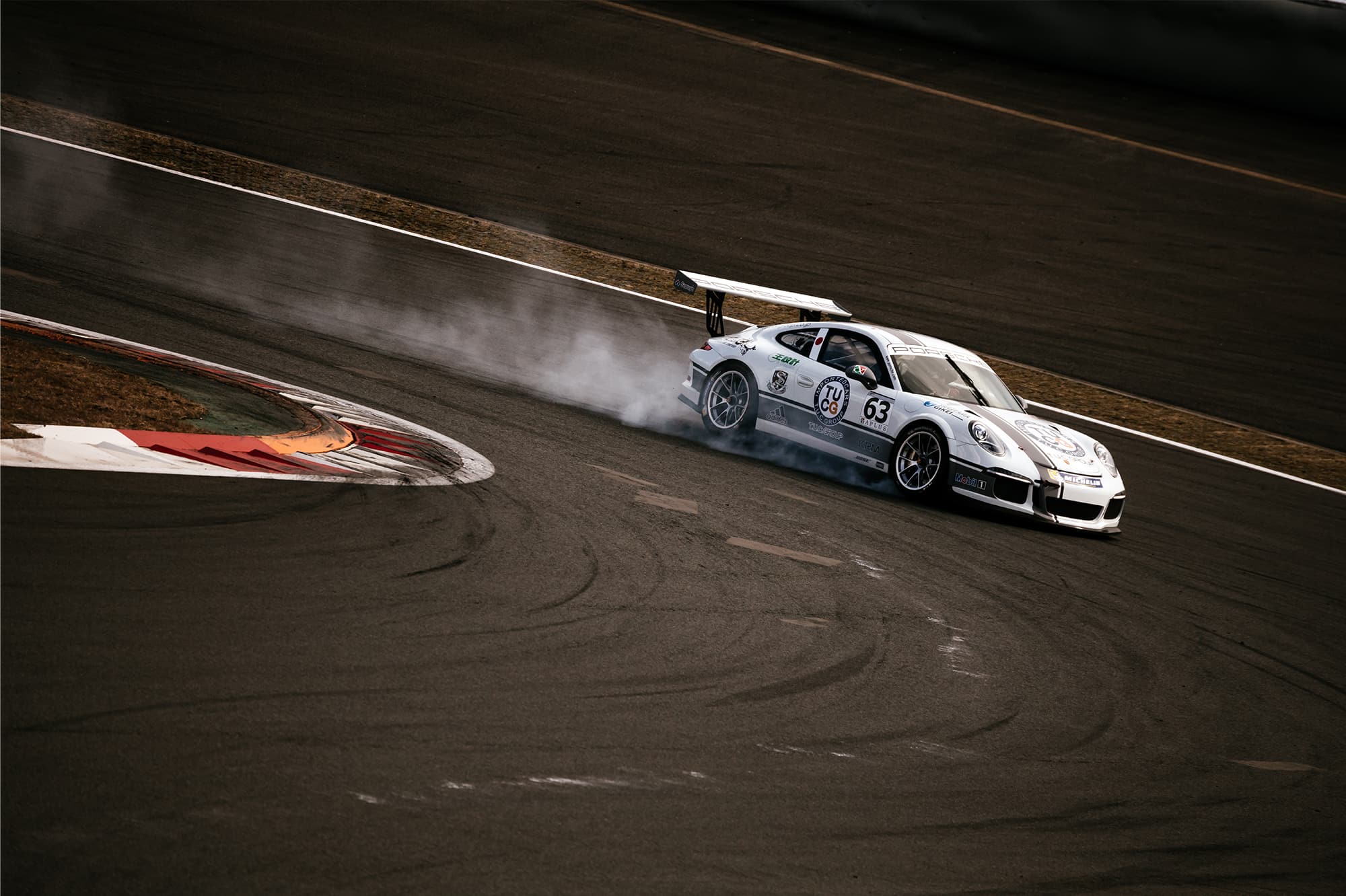 Usually, I use AF to freeze the subject and MF to pan. Drivers of the Carrera Cup adjust brake balance by themselves and their cars don’t have ABS. At this test driving, they were trying different things and I saw many cars whose brakes were locked up. I was tracking the car with the AF as it entered the corner, but it moved to the direction I didn’t predict. Even so, the lens captured it perfectly because of the smooth synchronization between the AF of the lens, the AF of the camera, and the OS of the lens.