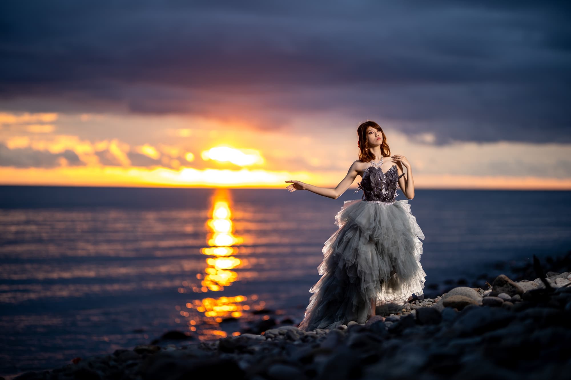 The lens is my favorite 105mm and the aperture setting is wide open, which is also my favorite. SIGMA 105mm F1.4 DG HSM | Art is great since the aperture can be wide open to F1.4 which makes an 3D impression to the model and the background. Since there is a sunset in the background, the model will be a black silhouette without using illumination. Here I use an electronic flash with a softbox one from the right and one from the back of the model to separate the model from the background. The back light used behind the model made a beautiful spatial effect to the dress.