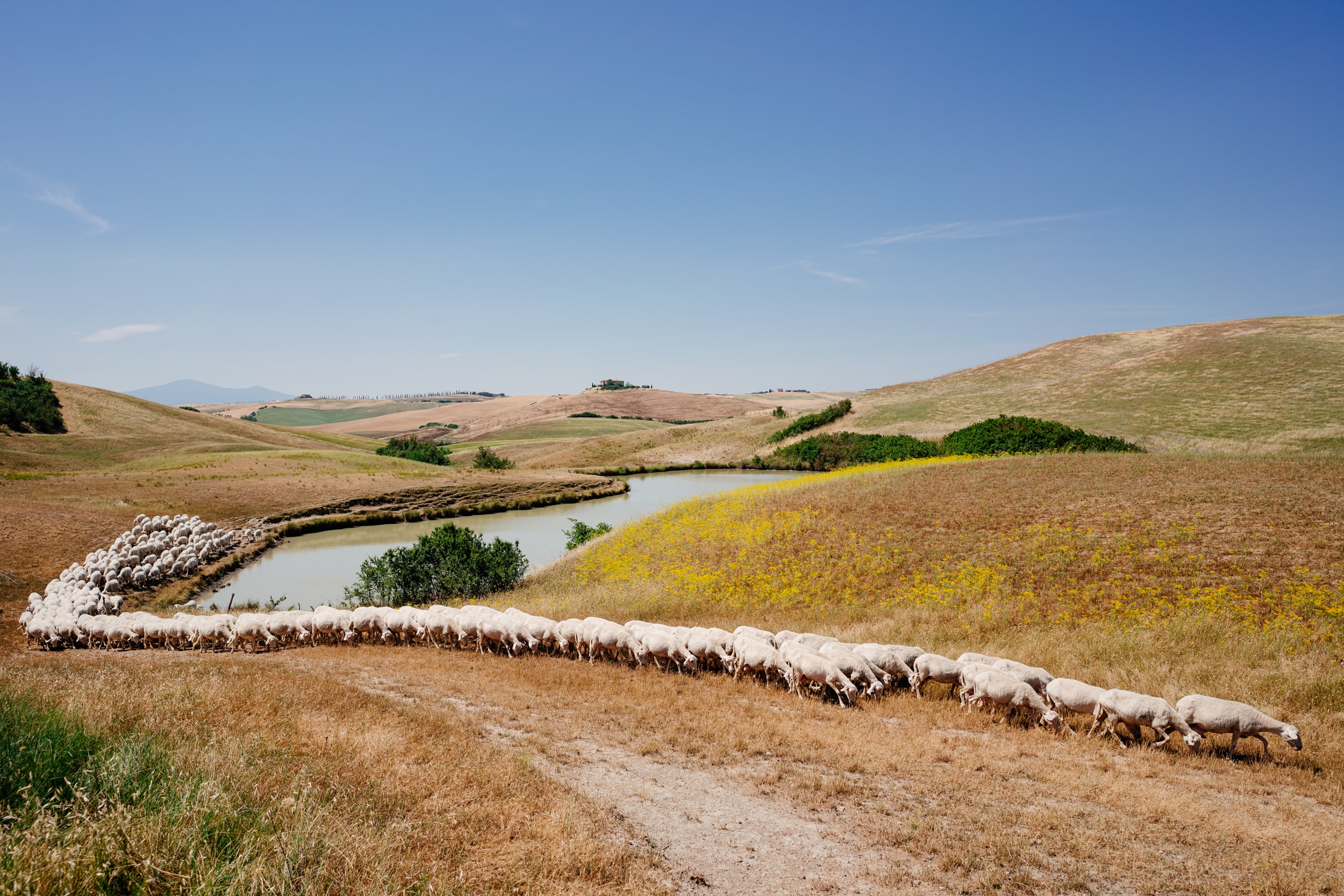 This 24mm lens really pushed me into the scene. In Tuscany, I witnessed the movement of a flock of sheep without a shepherd. The flock first went to a pond to drink and then continued to the hills.