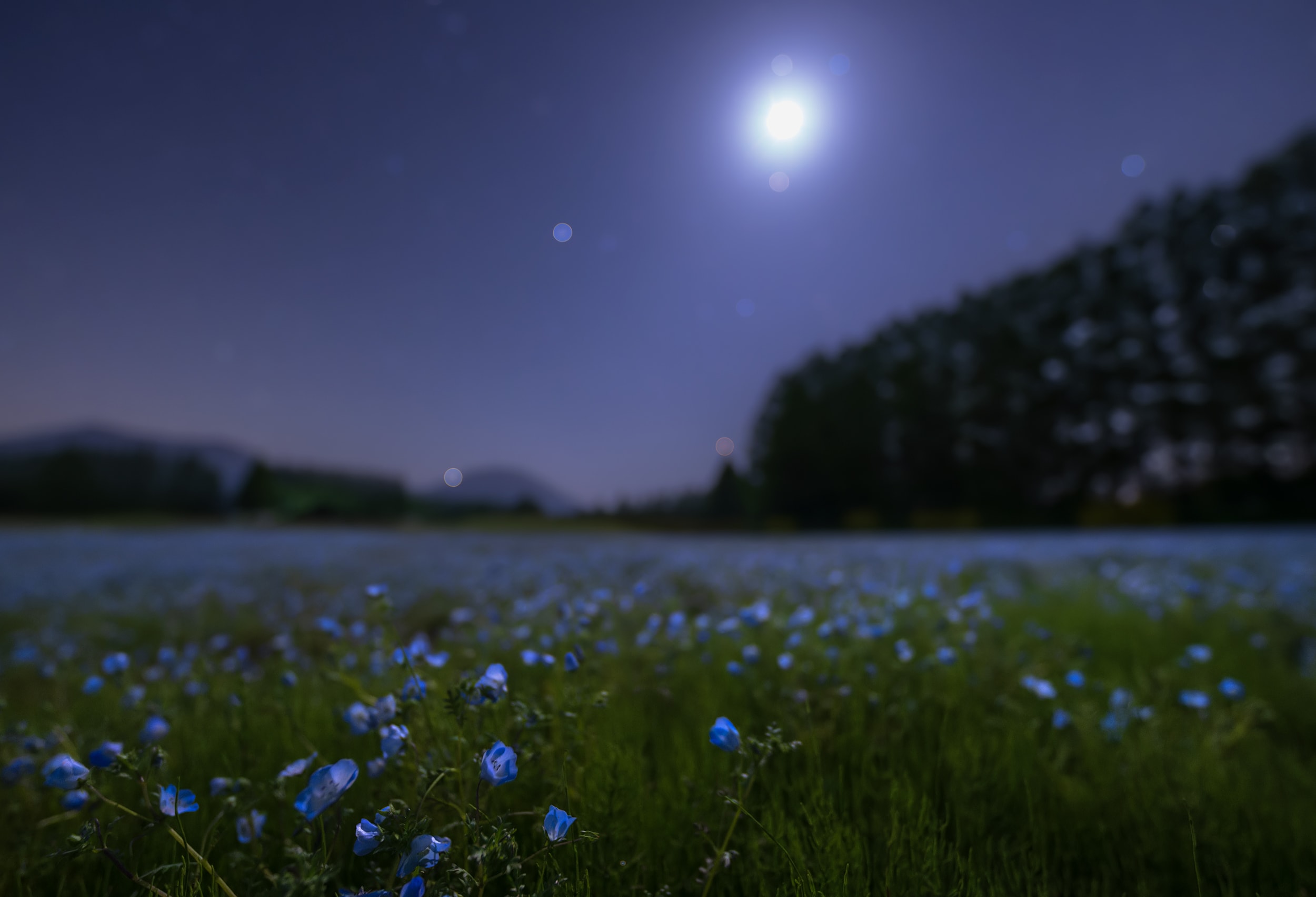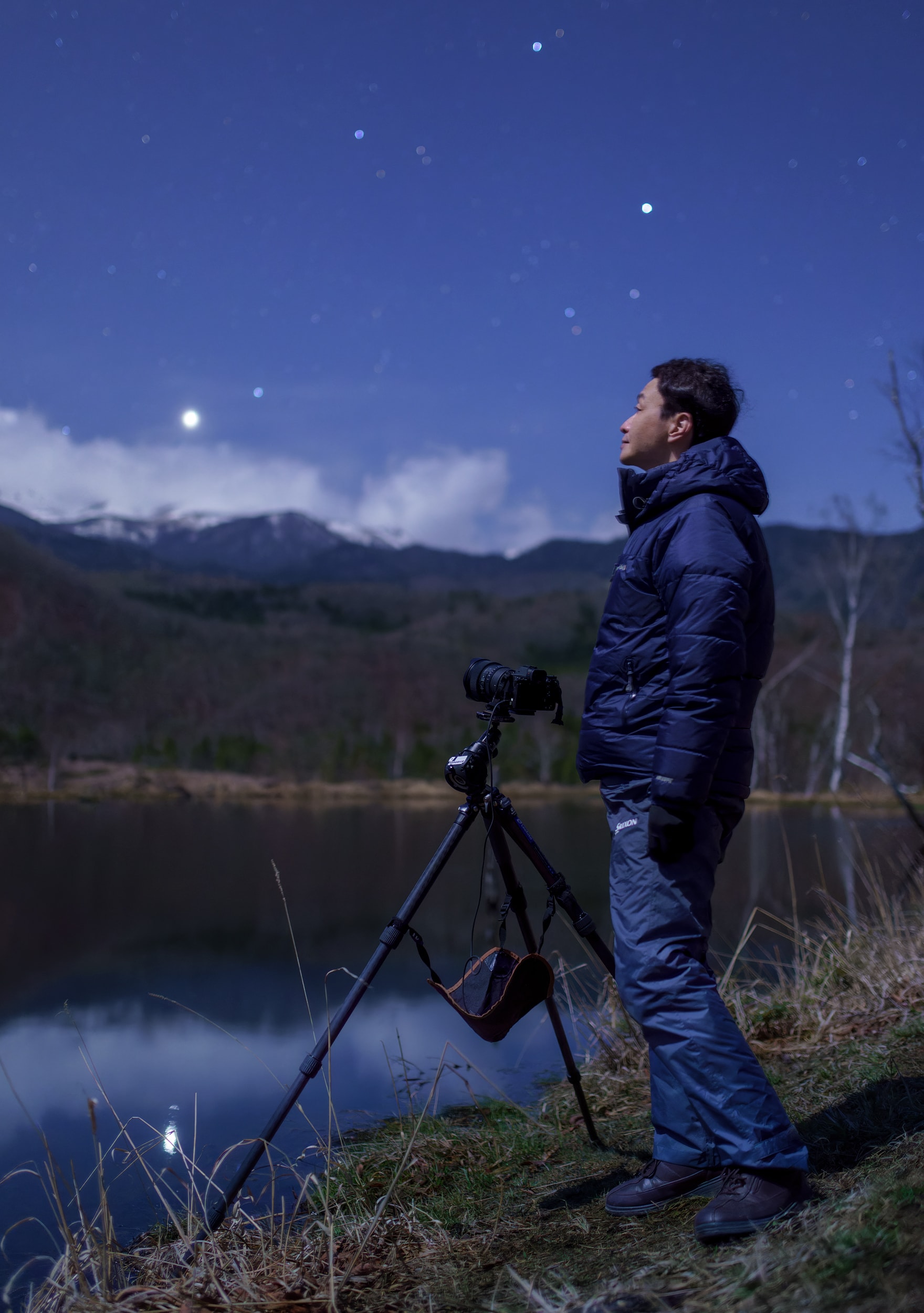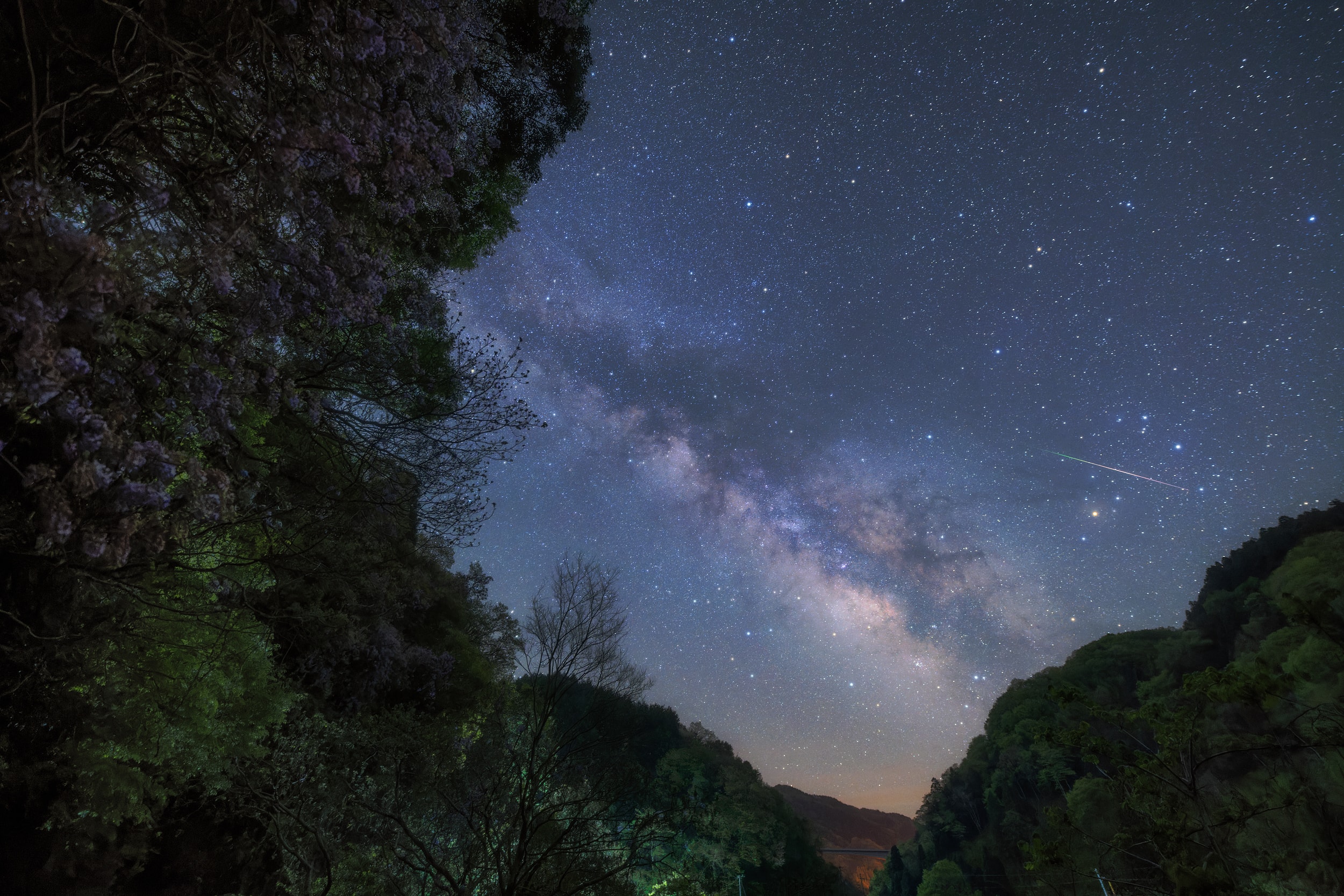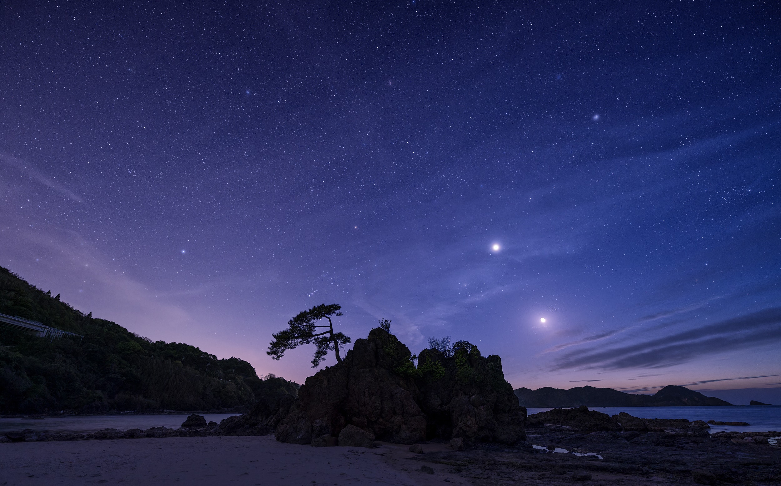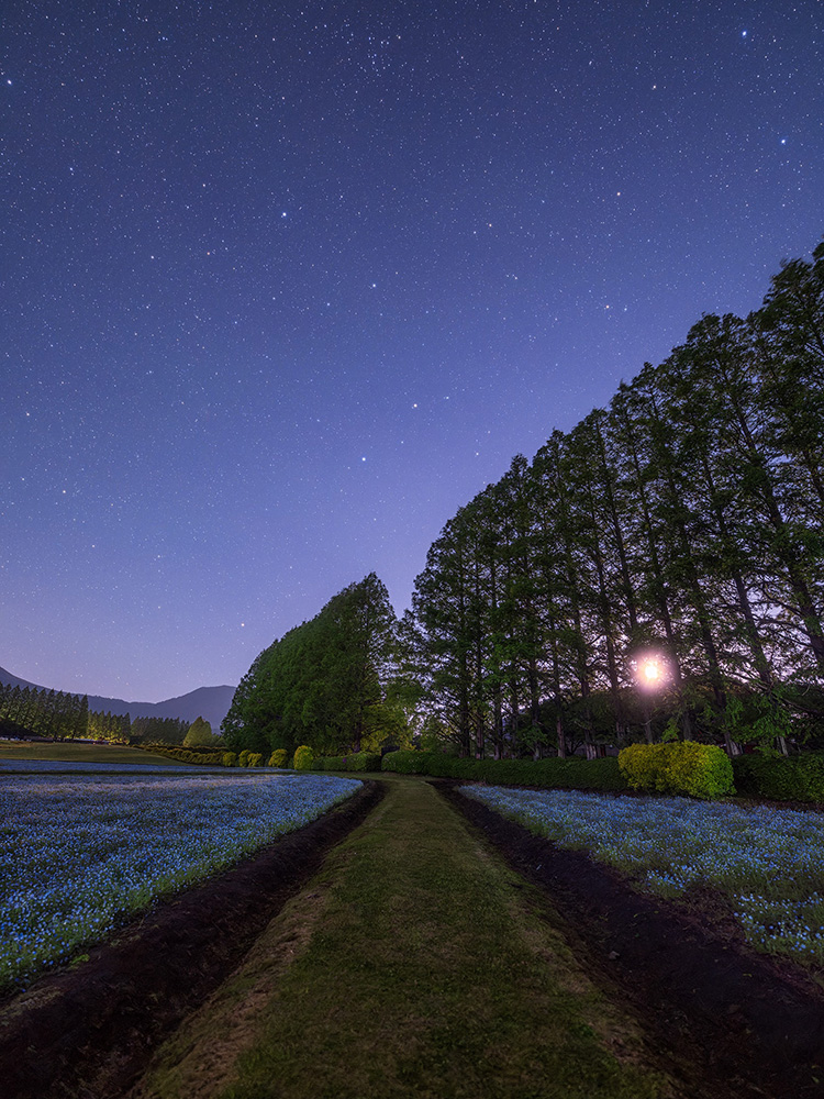 The moon and stars shine in the night sky, but the distance to the moon is only a second or so at the speed of light, and some light from the stars takes tens, hundreds or even thousands of years to reach us. On the other hand, from the nearby countryside and city lights, one can sense the warmth of life and culture of human beings, who were miraculously born in the universe. These are all connected events, and I love such scenes.
