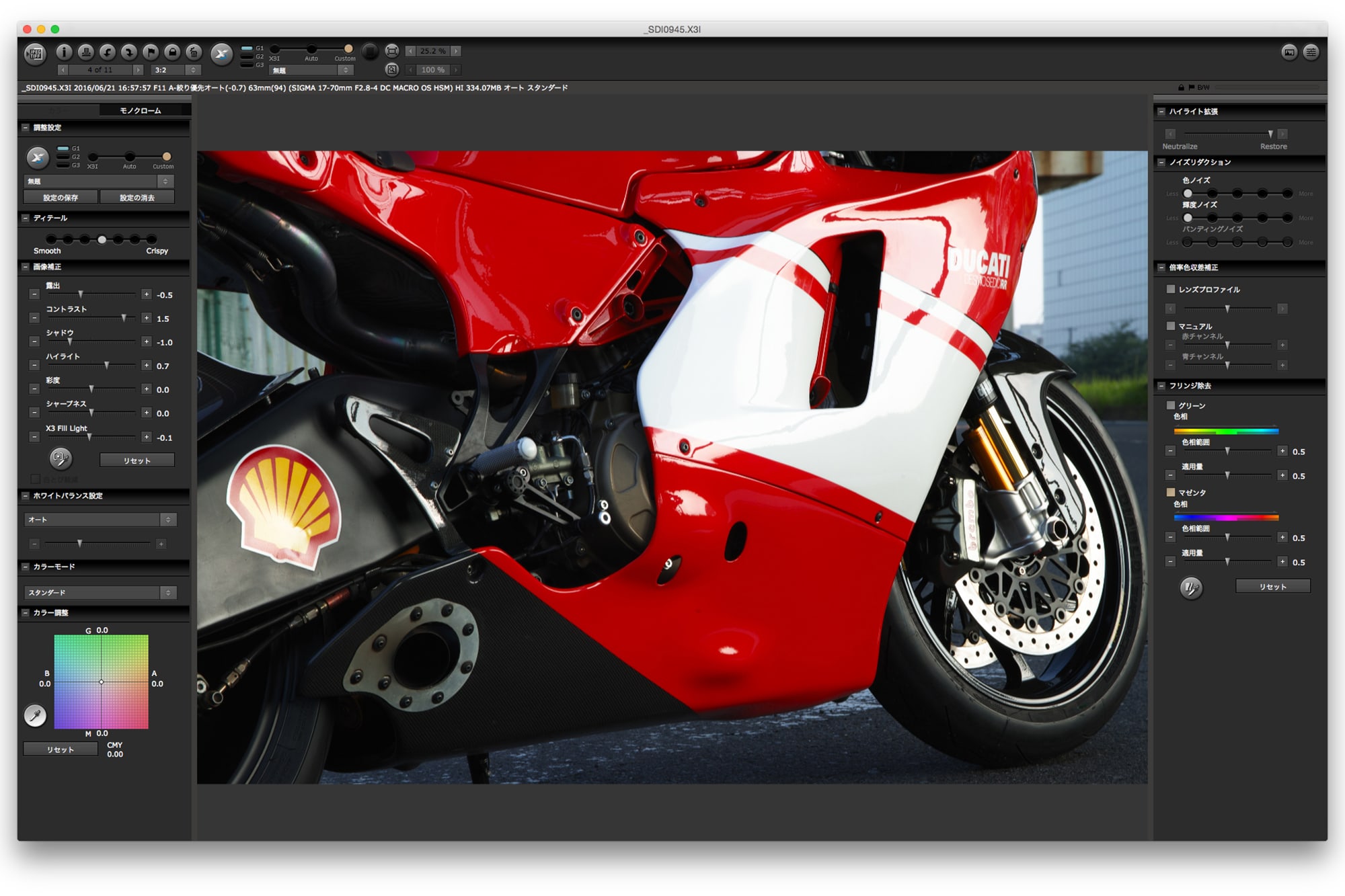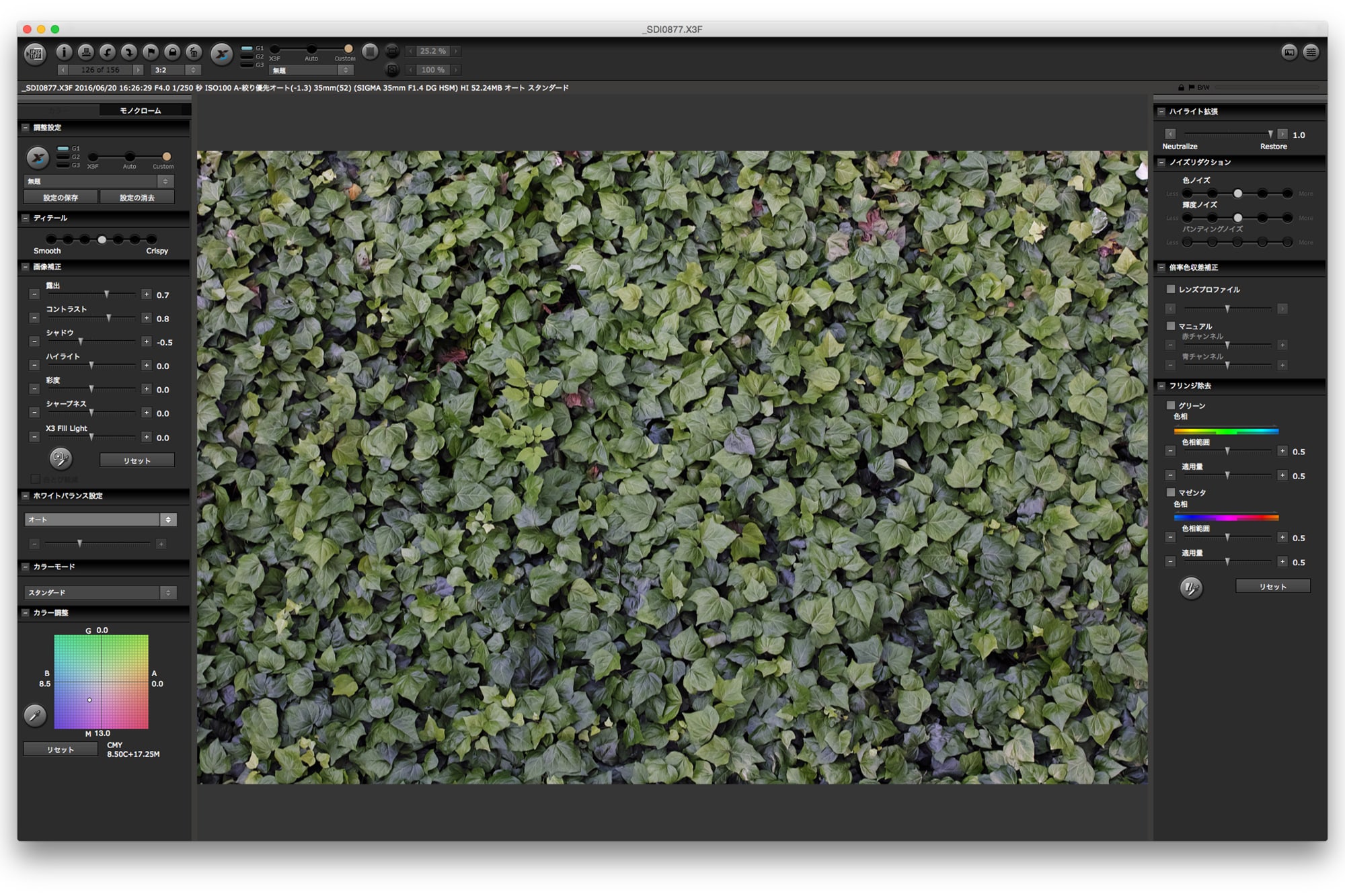 SIGMA users are familiar to developing RAW data. The software now features the new "detail” function that takes advantage of the Foveon sensor. I don’t know about it in detail, but as far as I tested, I found it works like the clarity control of conventional software or the unsharp mask although the effect is slightly different. Because of the thin drawing line and natural rendition, you can control sharpness freely. The image below was made by maximizing it.