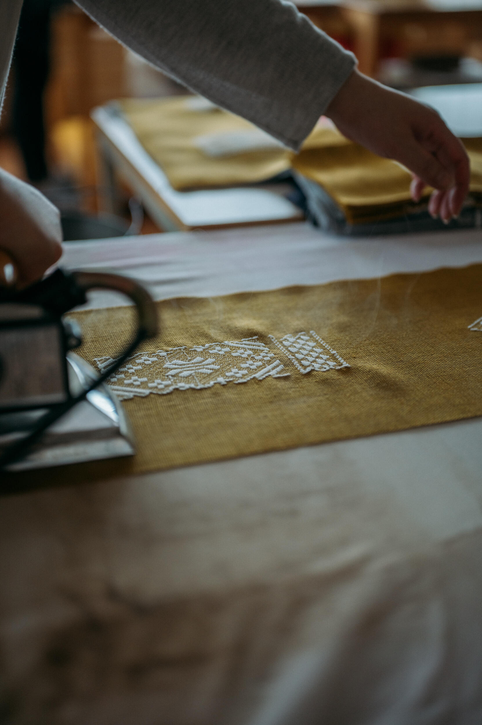 Several hundred years ago, the farmers of Tsugaru were not allowed to wear cotton kimonos. To make the long, harsh winters more bearable, they began to reinforce their linen and hemp clothes by embroidering them with cotton thread, thus giving birth to the local kogin-zashi technique of sashiko embroidery. Although it is a meticulous and detailed task, with an odd number of stitches for each vertical weave, the skilled hands of the local Tsugaru women complete it with astonishing speed and accuracy.