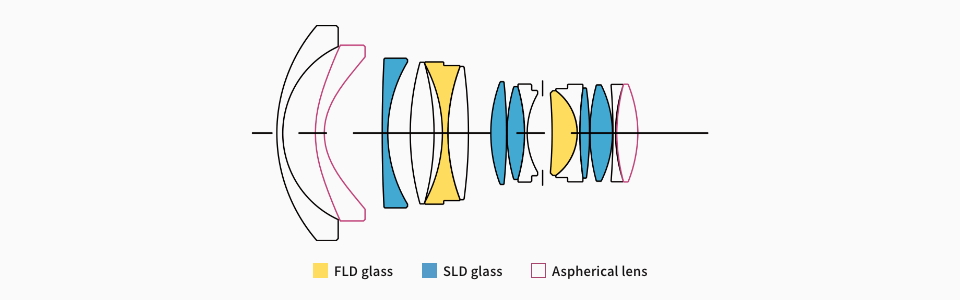 (*)FLD (“F” Low Dispersion) glass and five SLD (Special Low Dispersion) glass elements to minimize transverse chromatic aberration, which is mainly visible around the edge of the image. The optimized lens power distribution helps minimize axial chromatic aberration. As a result, this lens delivers high image quality in every situation without color smearing, and its rendering performance is consistently sharp with high contrast.(*)FLD ("F" Low Dispersion) glass