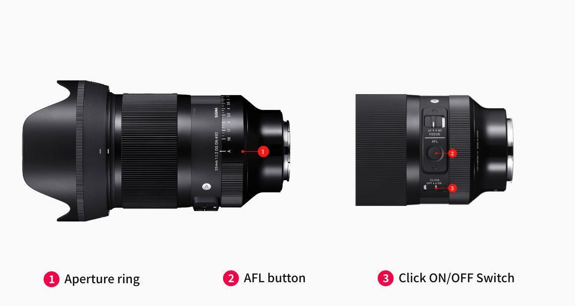 The 1 aperture ring is also mounted with a de-click function for removing clicks by the 3 Click ON/OFF Switch, enabling seamless operations that are especially useful such as during video shooting. Furthermore, the 2 AFL button which can be assigned with various functions widens the range of operations available on the lens. -