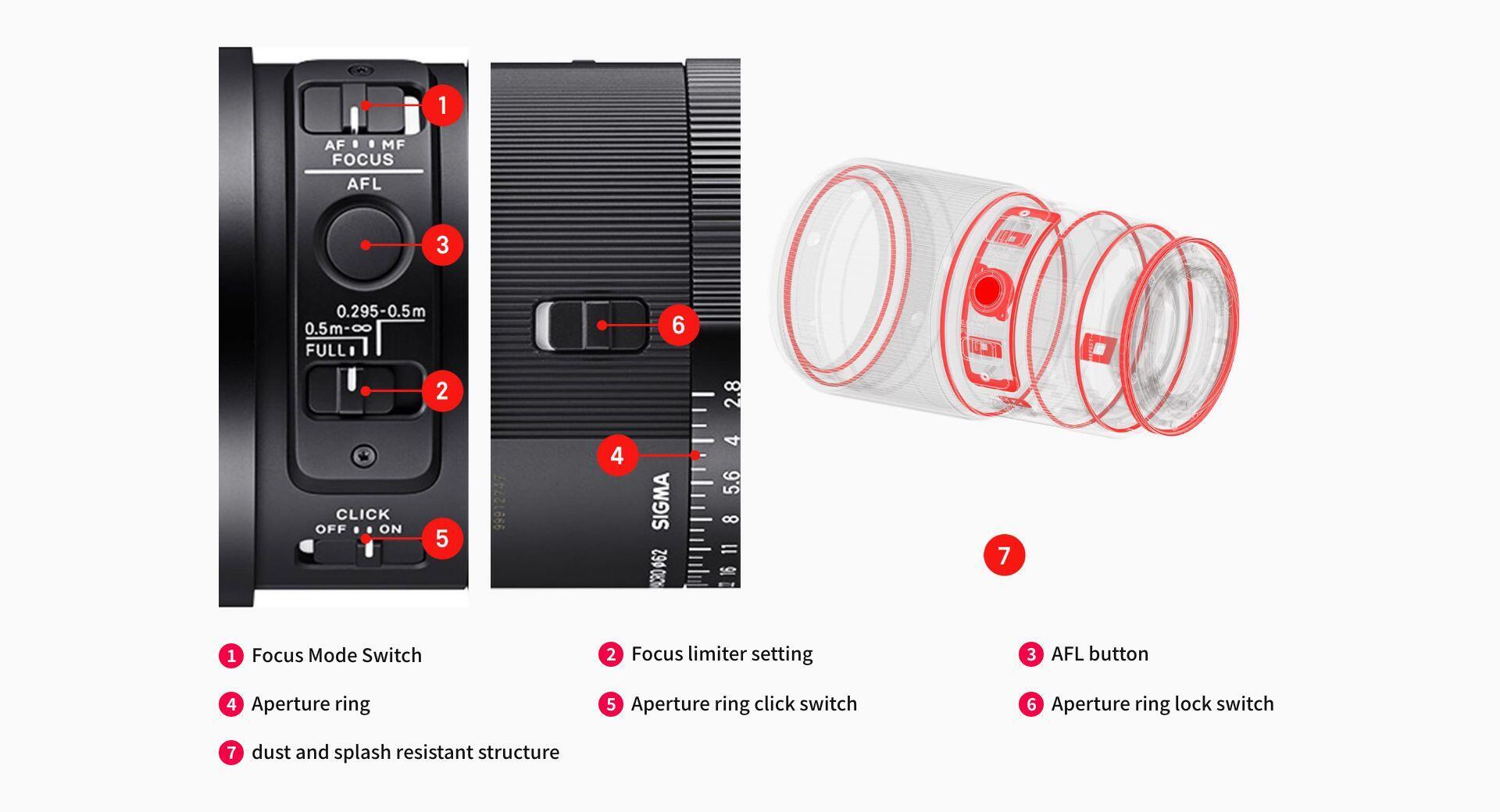 2 Focus limiter setting which comes in handy during macro shooting, and the 3 AFL button*1 to which users may assign select functions. The 4 Aperture ring, which is designed to help users work intuitively, has an 5 Aperture ring click switch to turn ON or OFF the clicking sound that isn’t required by some users when shooting macro. It also comes with a 6 Aperture ring lock switch*2 for a ring lock system. Its enhanced functions allow users to customize their shooting operations in accordance with their shooting styles.
