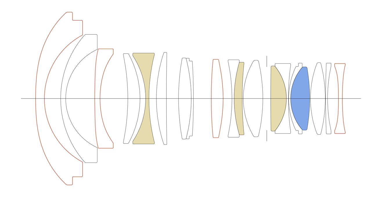 19 elements in 15 groups (3 FLD, 1 SLD, and 4 aspherical elements)