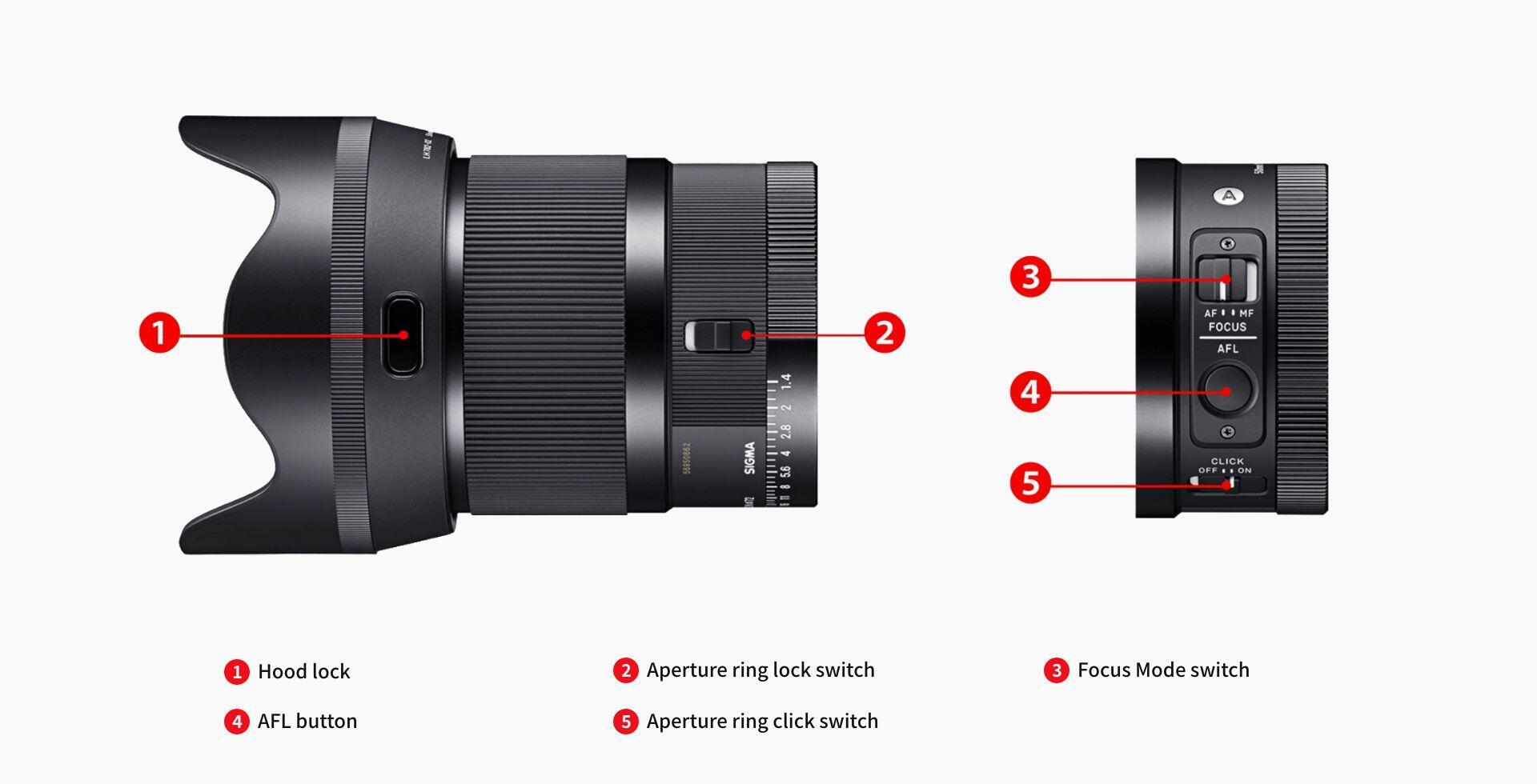 The lens barrel is equipped with a Focus Mode switch, an Aperture ring click switch to turn the click on and off, an Aperture ring lock switch to prevent unintended operation, and an AFL button to assign any function from the camera. These features are designed for intuitive operation during shooting. -