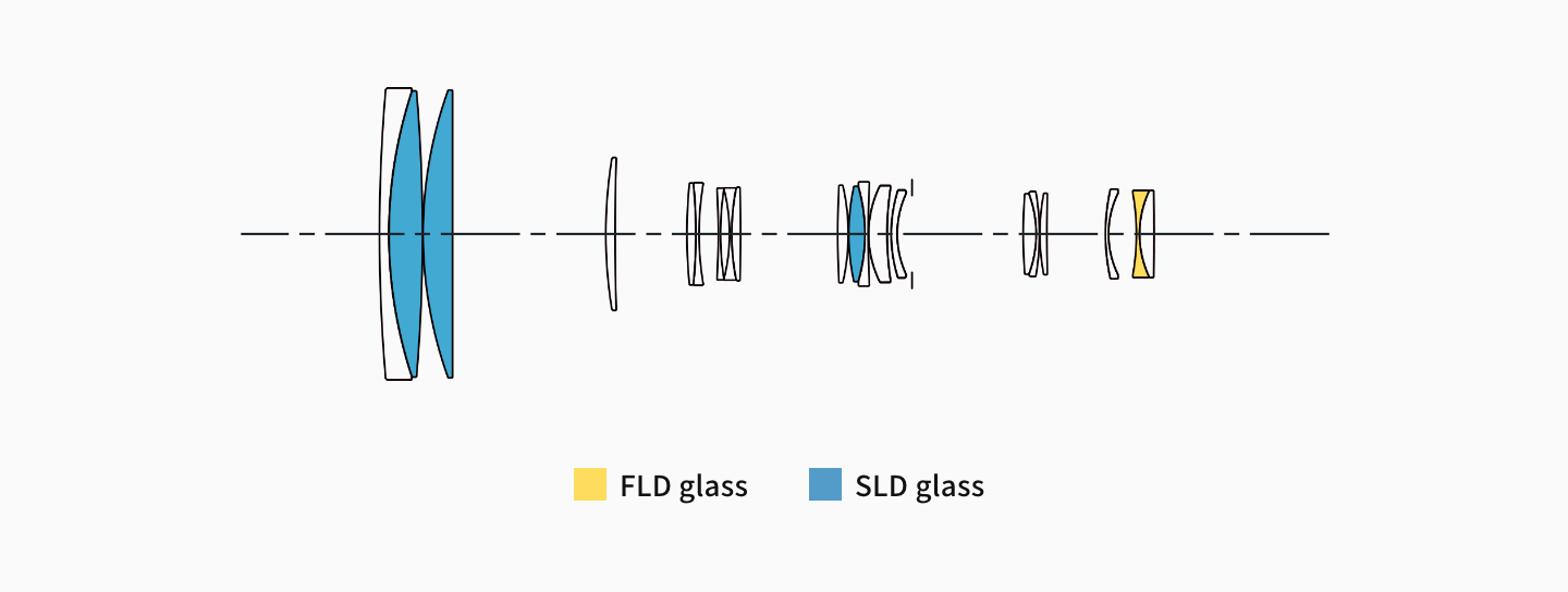 FLD glass is ultra-low-dispersion glass that offers performance of the highest level. Highly transparent, its refractive index and dispersion are extremely low as compared to conventional types of glass. It offers characteristics very similar to those of fluorite, which is valued for its anomalous dispersion. These characteristics minimize residual chromatic aberration (secondary spectrum), which cannot be corrected by ordinary optical glass, while helping to produce sharp, high-contrast images. -