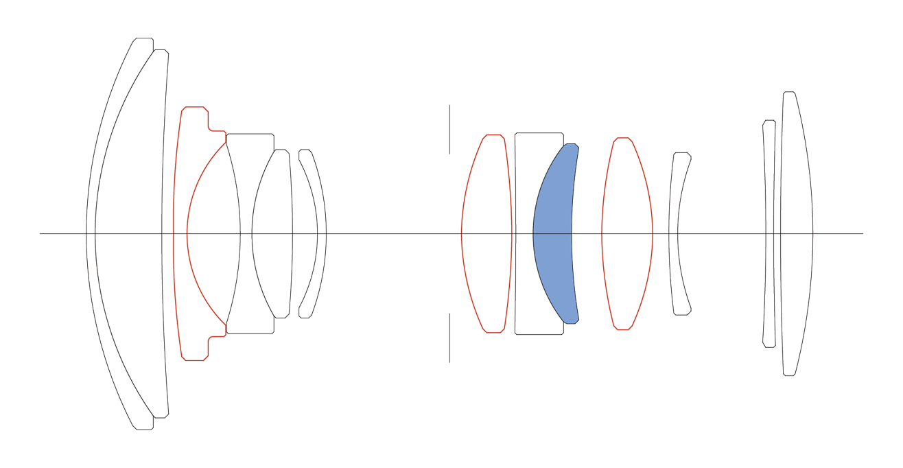 10 groups, 13 elements (1 SLD and 3 aspherical lenses)