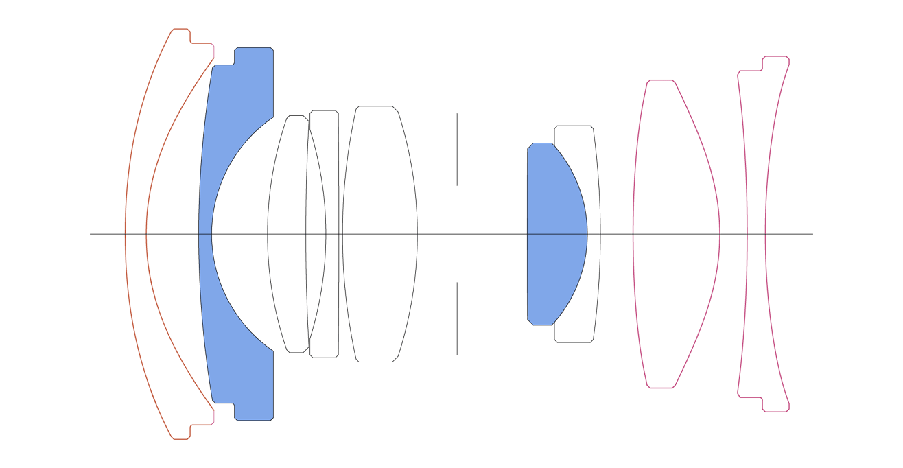 9 elements in 8 groups (2 SLD, 3 aspherical lens elements)