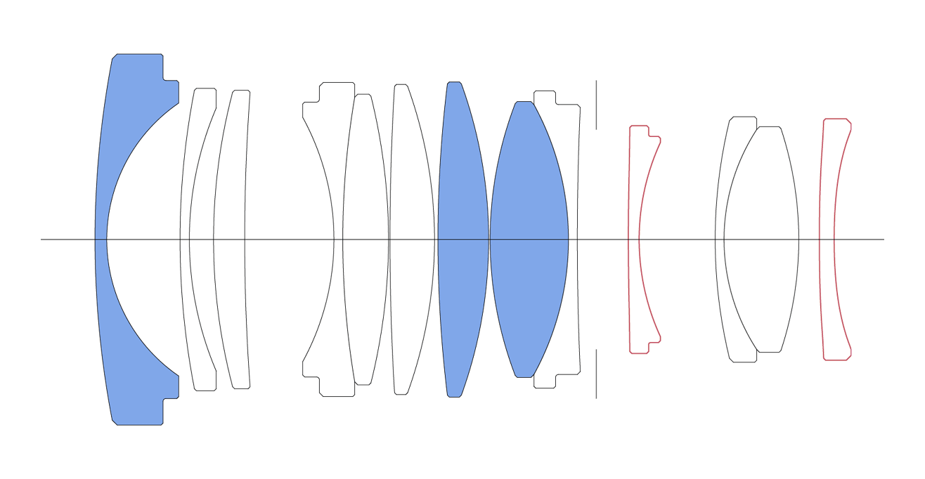 13 elements in 10 groups (3 SLD and 2 aspherical elements)