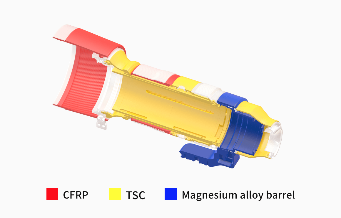 The lens features a multi-material structure, in which materials such as magnesium, CFRP*1, and TSC*2 are optimally arranged according to their characteristics. As a result, the lens barrel is lighter in weight while retaining the same robustness as previous models, thereby providing high versatility in a variety of scenes and applications.
