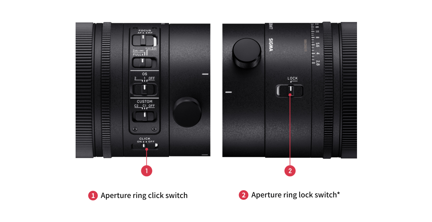 This is the first Sigma zoom lens for still photography to be equipped with an aperture ring. It is also equipped with an aperture ring click switch and an aperture ring lock switch, allowing for aperture operation suited to the shooting application.