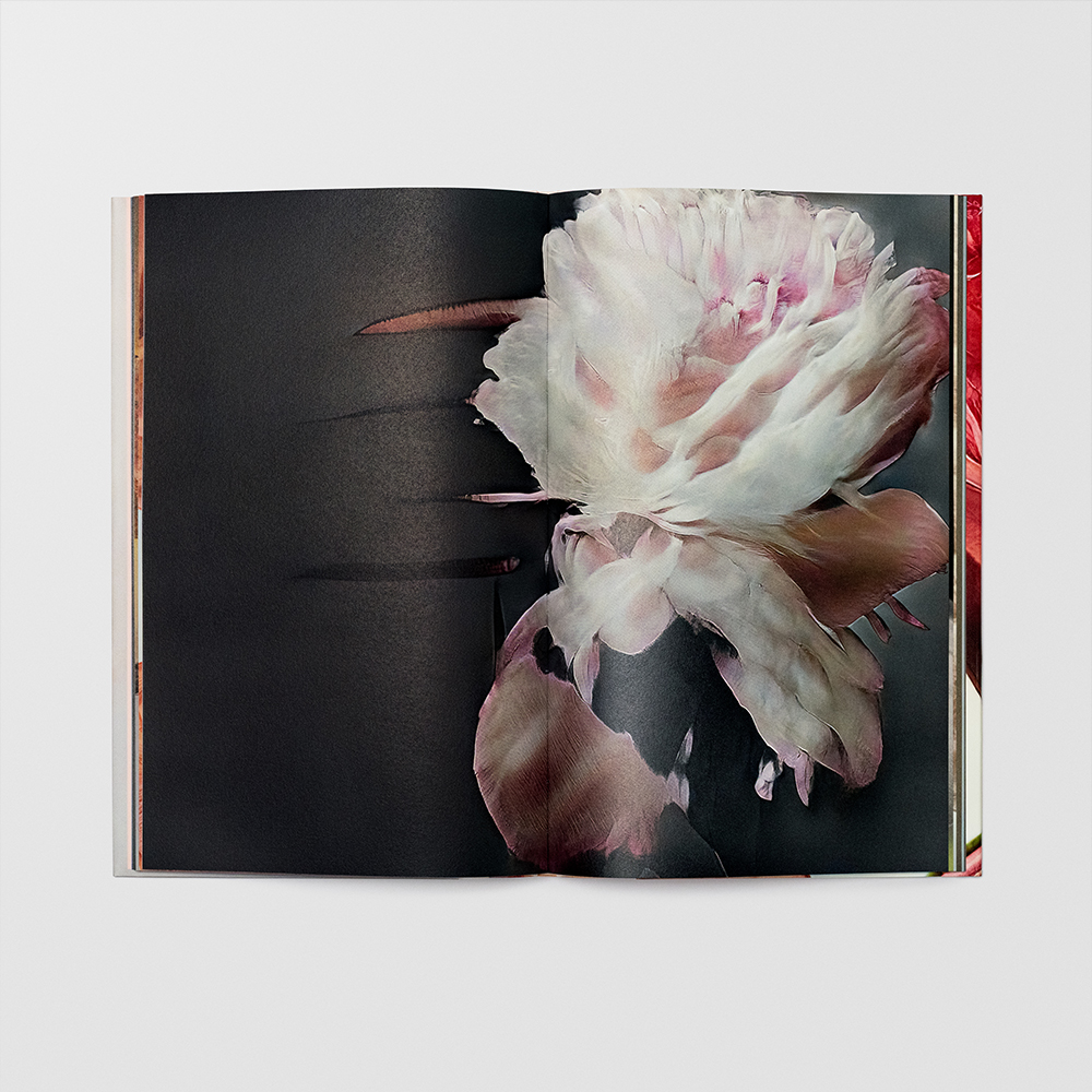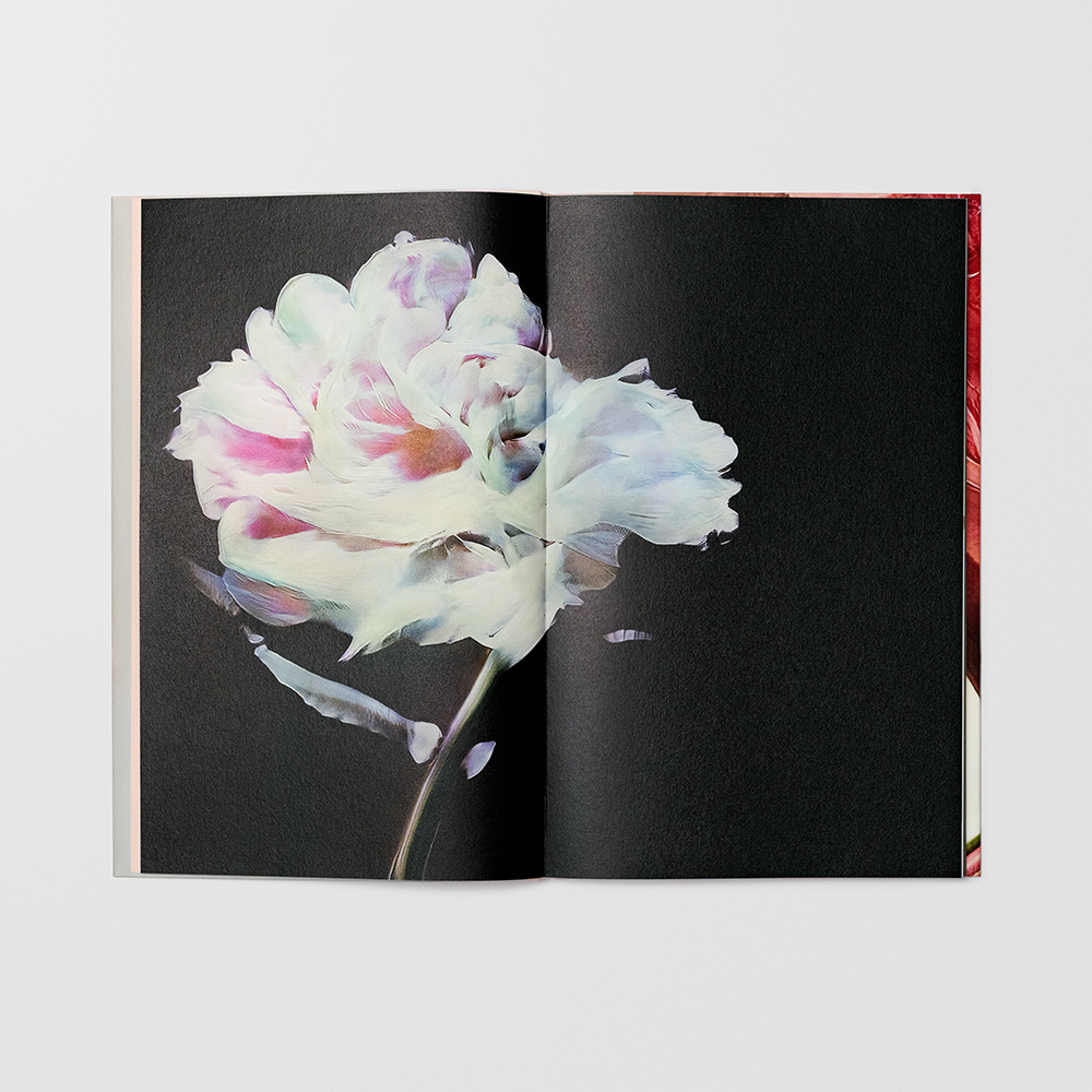 In his latest work, HANATABA, Sundsbø explores the concept of “sublimely beautiful forms of life – which don’t exist.” Using a vast archive of his own flower photographs, he developed a custom AI program to generate entirely new, otherworldly floral creations—images of flowers that have never existed in reality. Each piece is accompanied by a fictitious Latin botanical name generated by the AI, resulting in a poetic compendium that resembles a field guide to flora from another realm.