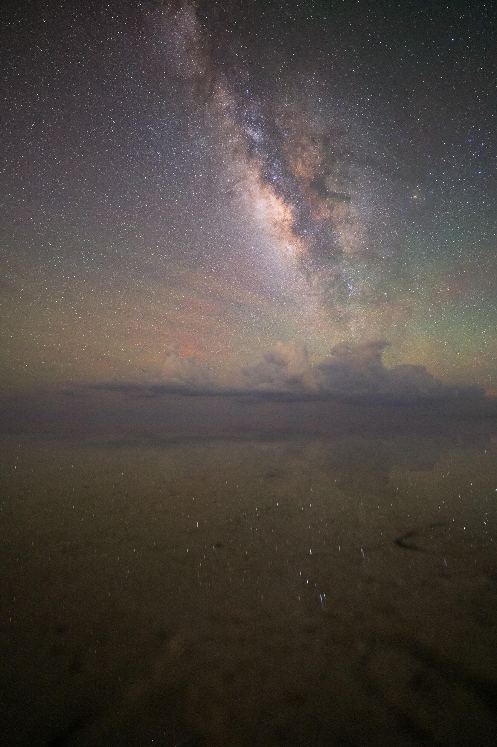 The rest of the night continued similarly. Arriving at a new location, excitedly checking the back of the camera, and immediately thinking about the next shot. One of my favorite moments of the night came after most of the clouds passed and the wind died down completely. The shallow water had virtually turned into a mirror and was reflecting the night sky. I used a smaller tripod to place the camera just above the water to capture what felt like an incredibly unique scene.