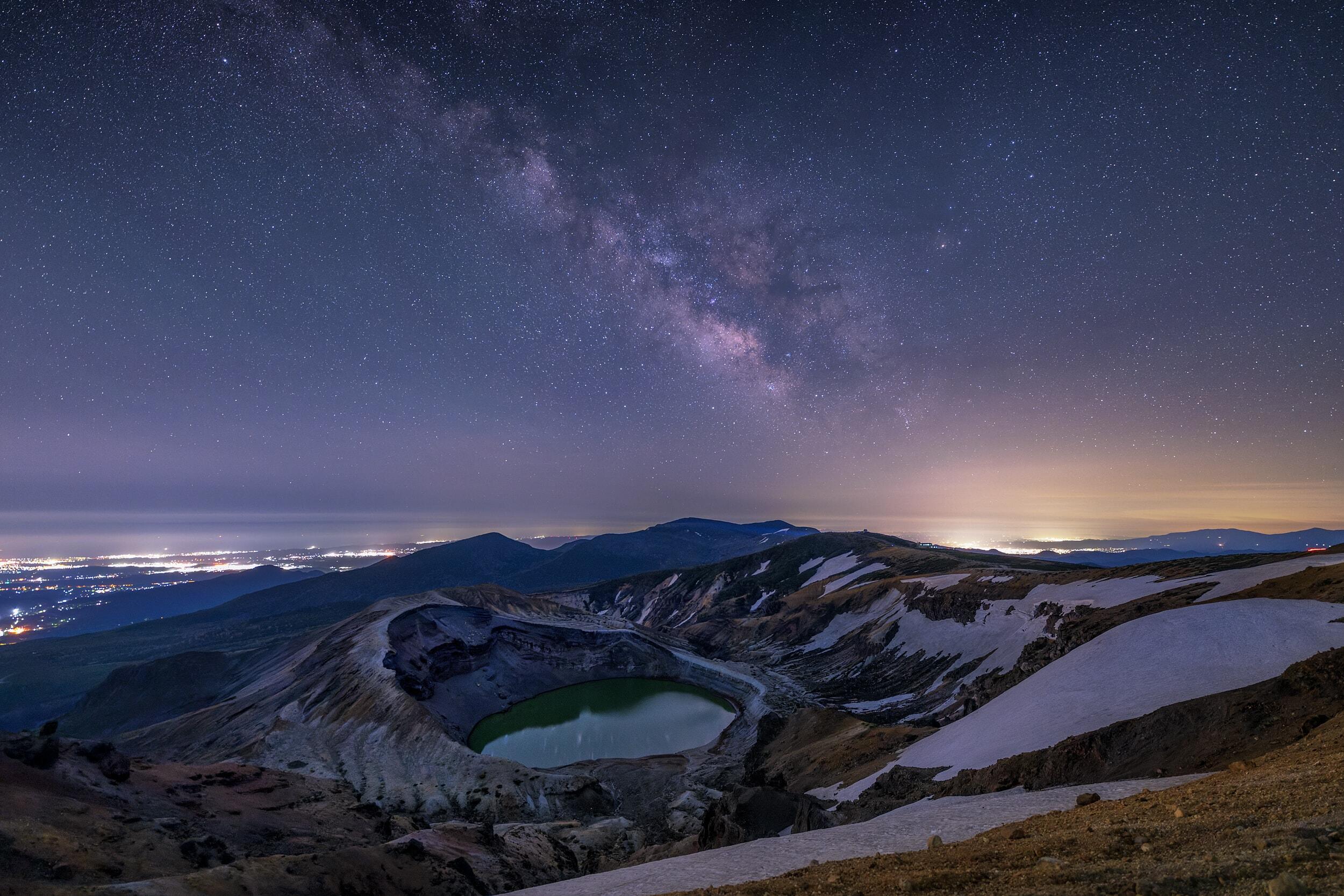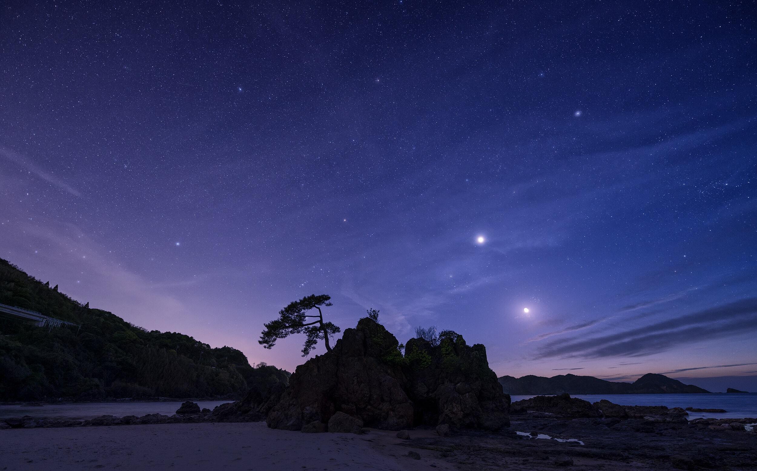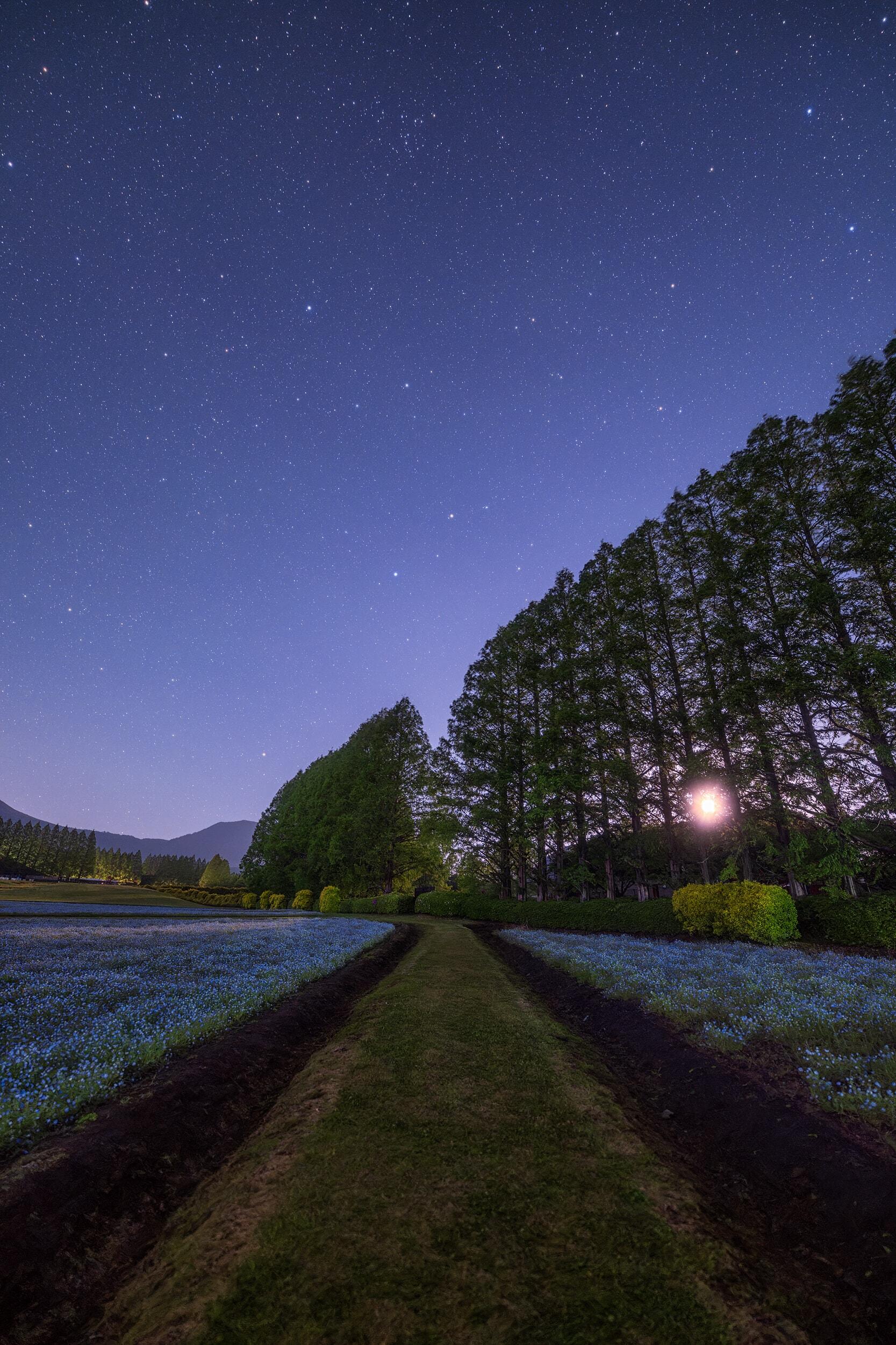 We live in a tremendously large world. This is especially apparent at night. The moon and stars shine in the night sky, but the distance to the moon is only a second or so at the speed of light, and some light from the stars takes tens, hundreds or even thousands of years to reach us. On the other hand, from the nearby countryside and city lights, one can sense the warmth of life and culture of human beings, who were miraculously born in the universe. These are all connected events, and I love such scenes.