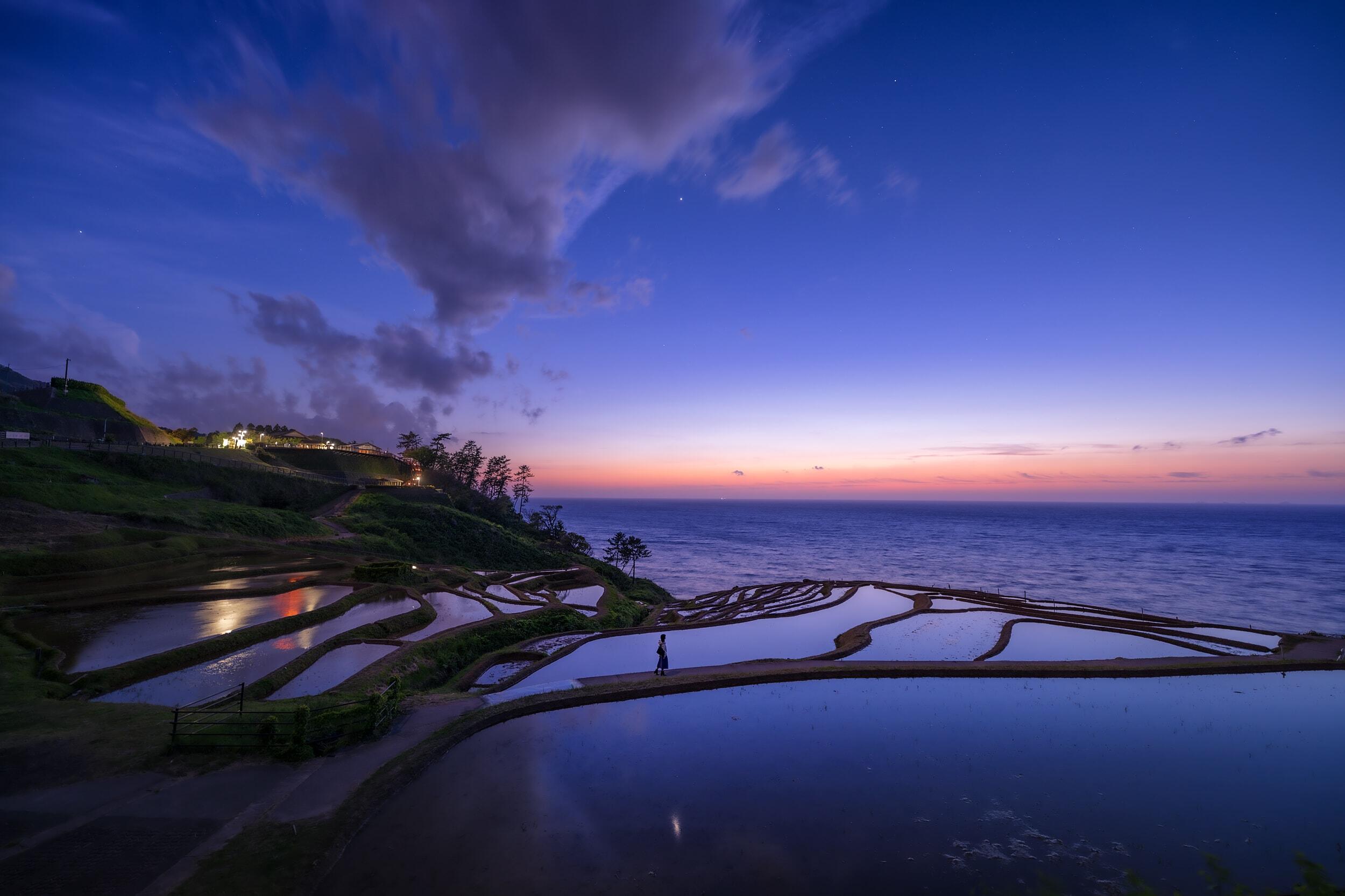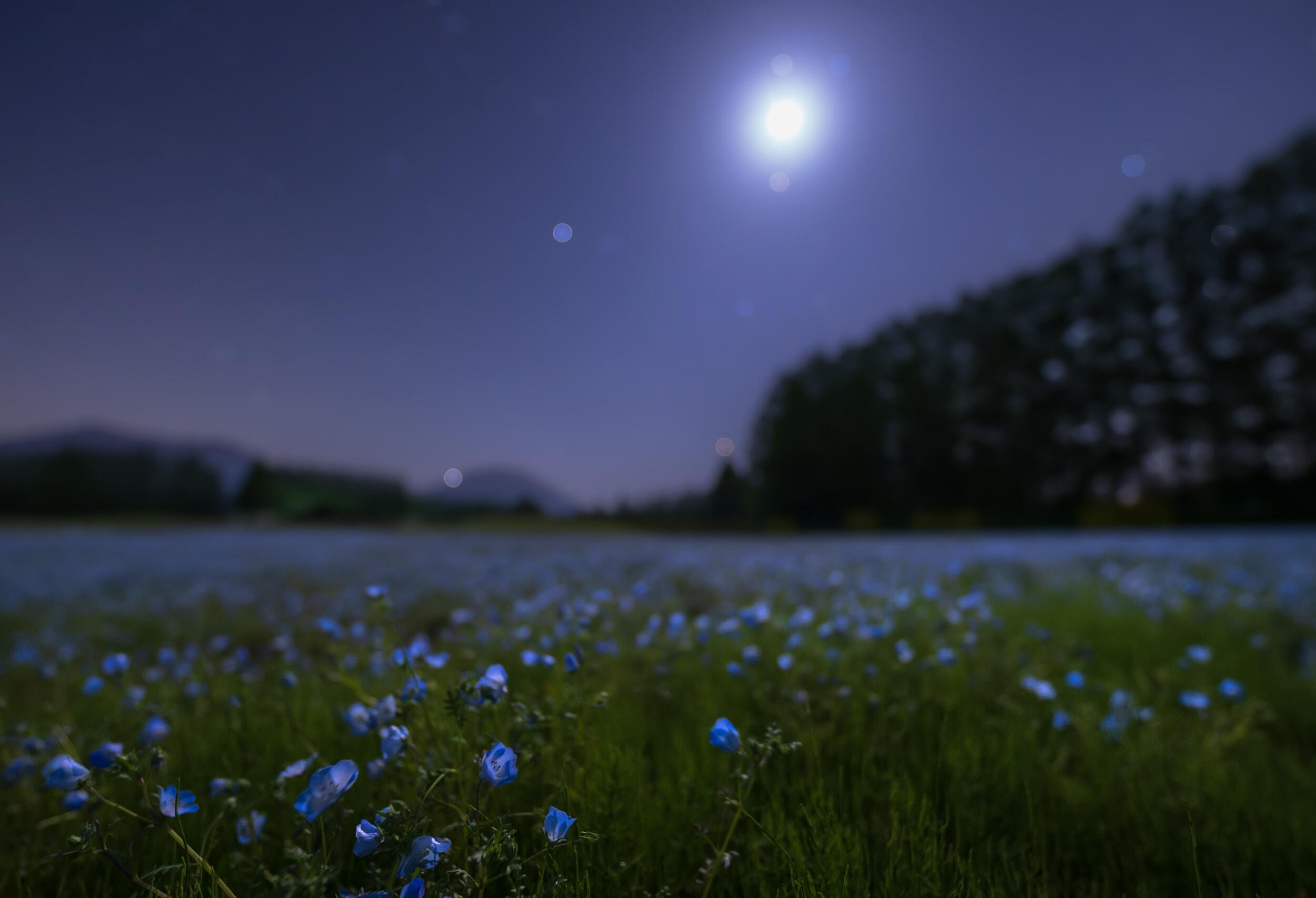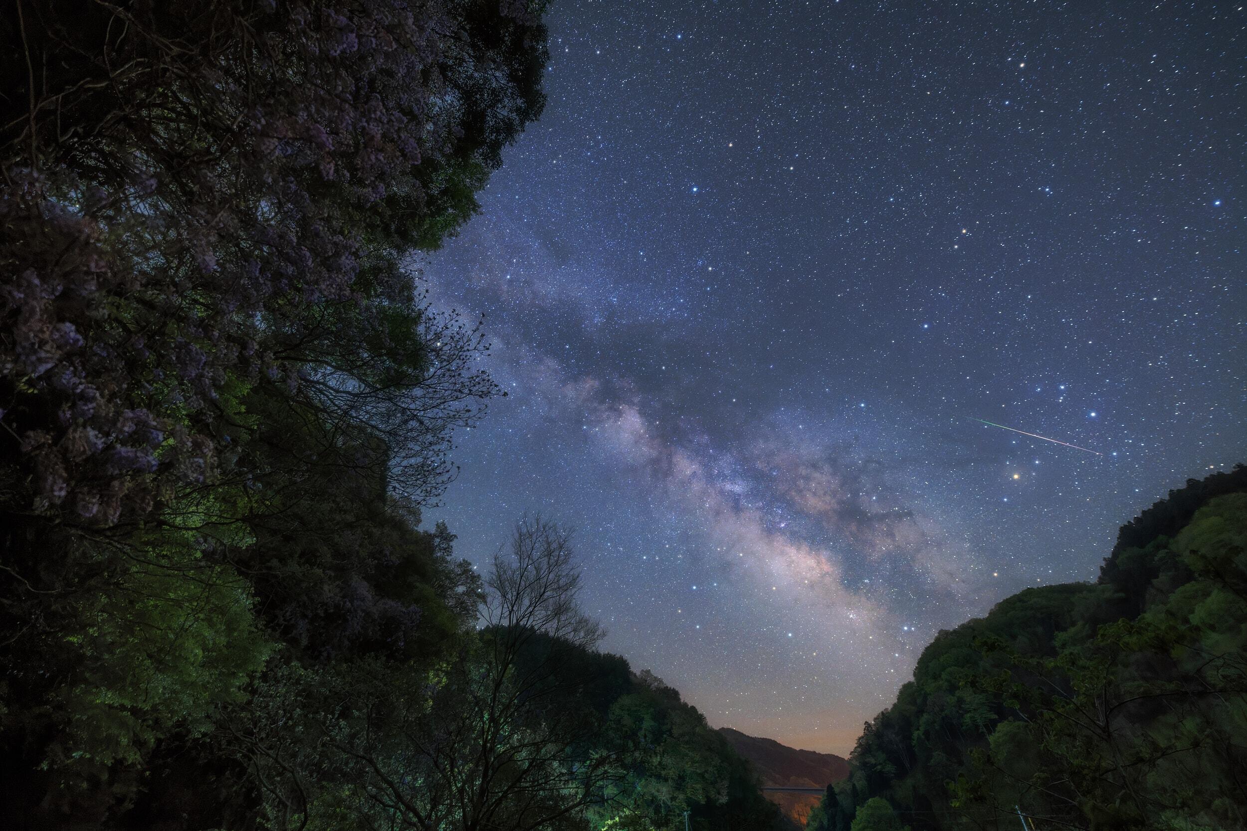 We live in a tremendously large world. This is especially apparent at night. The moon and stars shine in the night sky, but the distance to the moon is only a second or so at the speed of light, and some light from the stars takes tens, hundreds or even thousands of years to reach us. On the other hand, from the nearby countryside and city lights, one can sense the warmth of life and culture of human beings, who were miraculously born in the universe. These are all connected events, and I love such scenes.