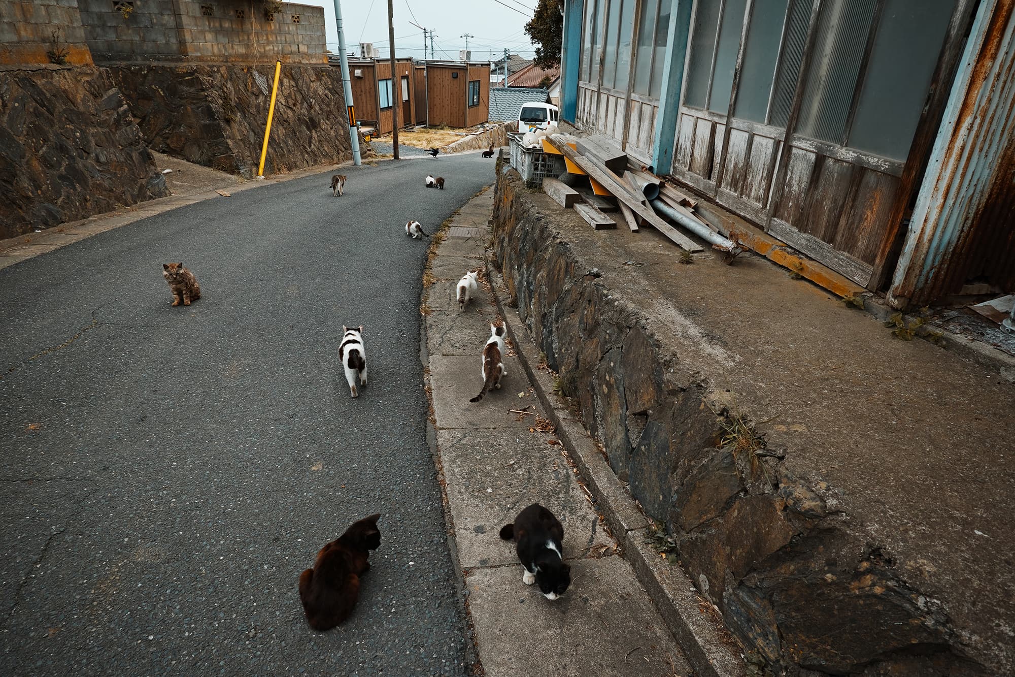 ネコの島・田代島。ネコたちが路上でくつろいでいるところに、カラスがちょっかいを出しに舞い降りた。寝転んでいたネコたちが一斉に反応したところをSIGMA dp0 Quattroで撮った1枚。「ティールアンドオレンジ」で当時の印象がノスタルジックに蘇った。