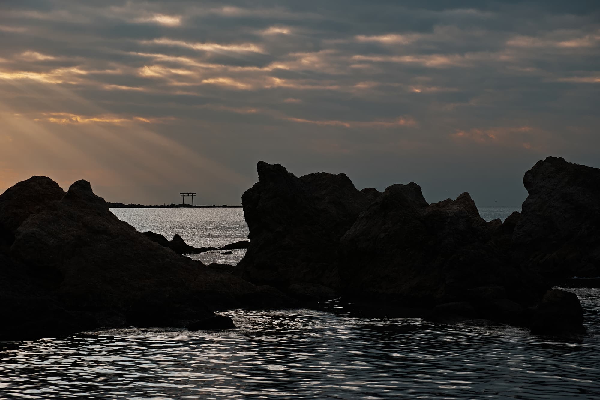 葉山・森戸神社の鳥居をSIGMA dp3 Quattroで。このカメラは一番のお気に入りだ。距離感といい、解像感といい最高の1台である。そのお気に入りで、磯越しに光を浴びる鳥居を狙った。その場で感じた印象を「ティールアンドオレンジ」でドラマチックに仕上げることができた。