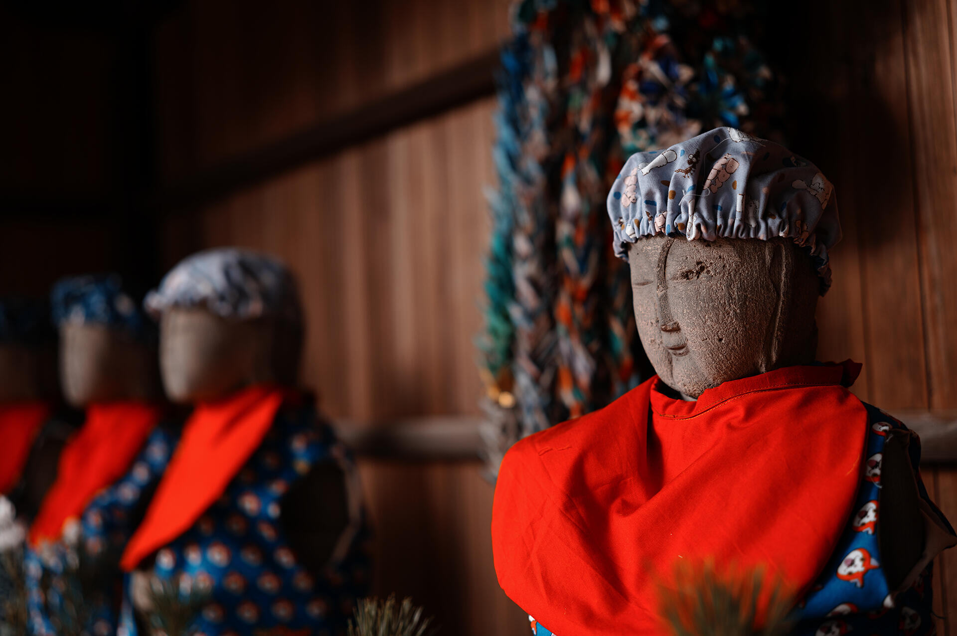 寺で六地蔵を撮っていたところ、急に寒風が吹き始めた。