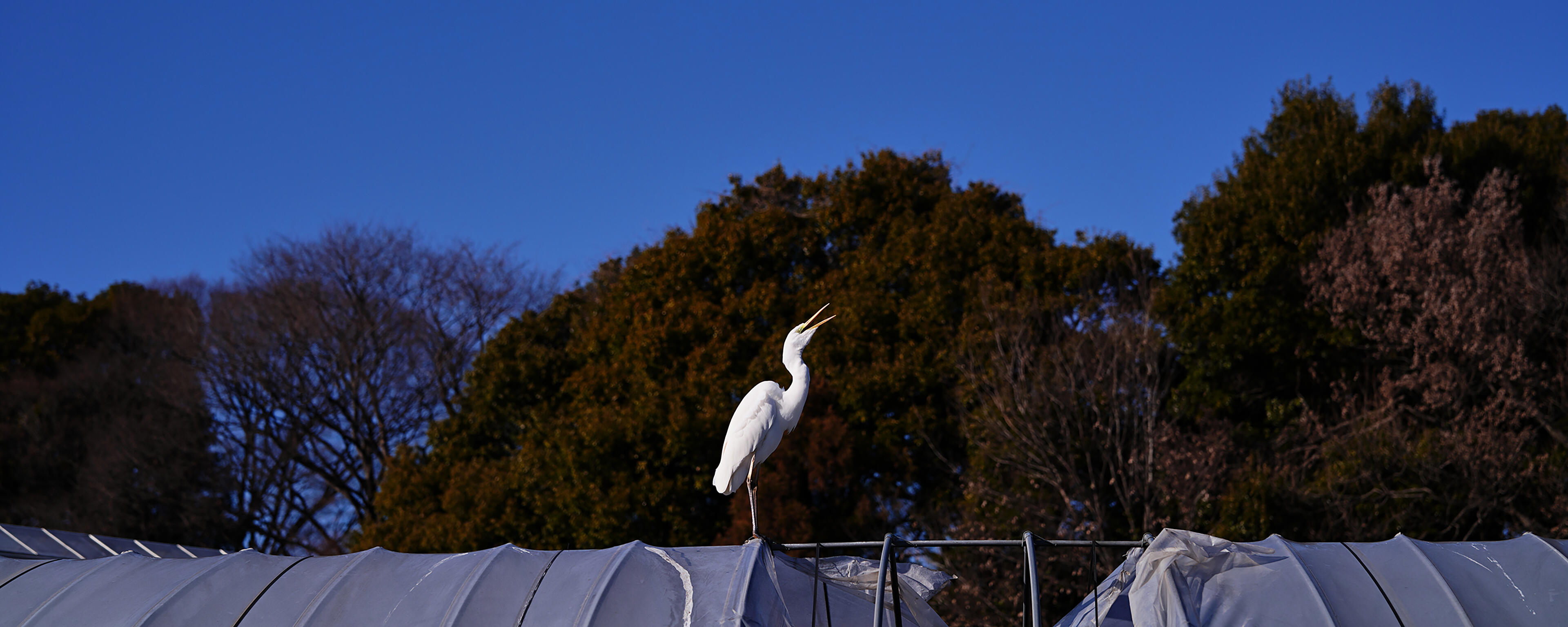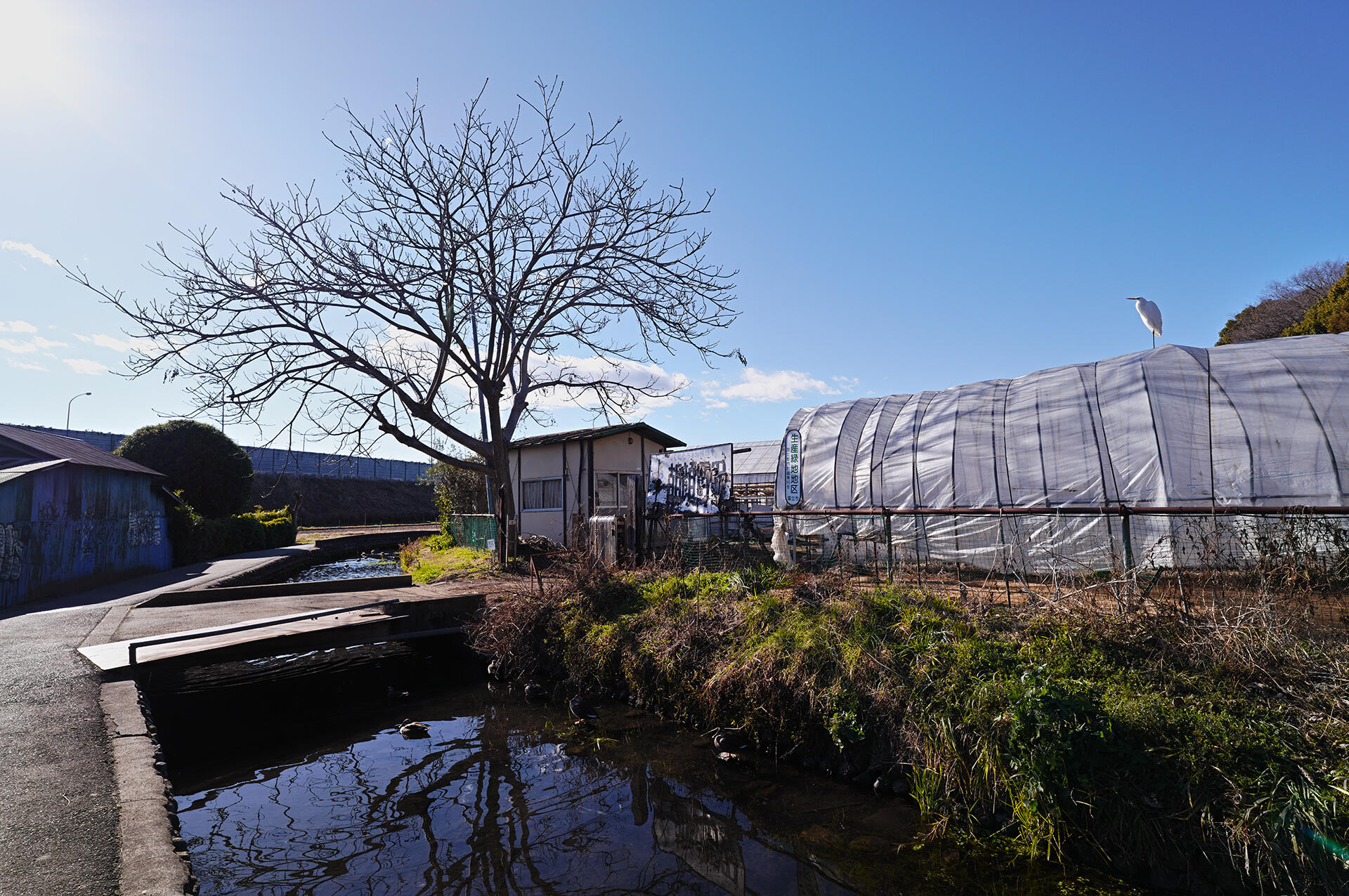 農地の横を流れる用水には水鳥が多く集まっていた。