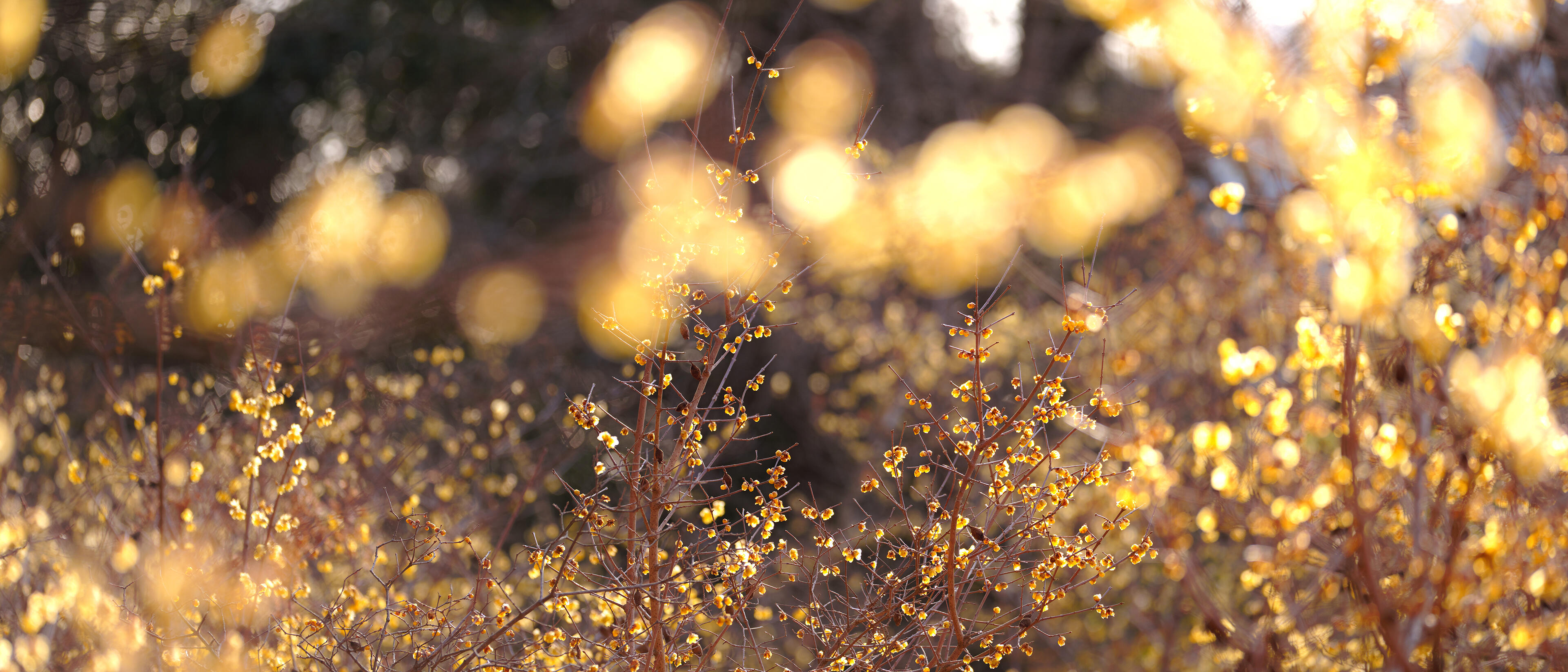 ロウバイの丘に到着時は届いてはいなかった朝陽が差し始め、花がテカり、蝋細工のようなコーティングをしているように見えた。