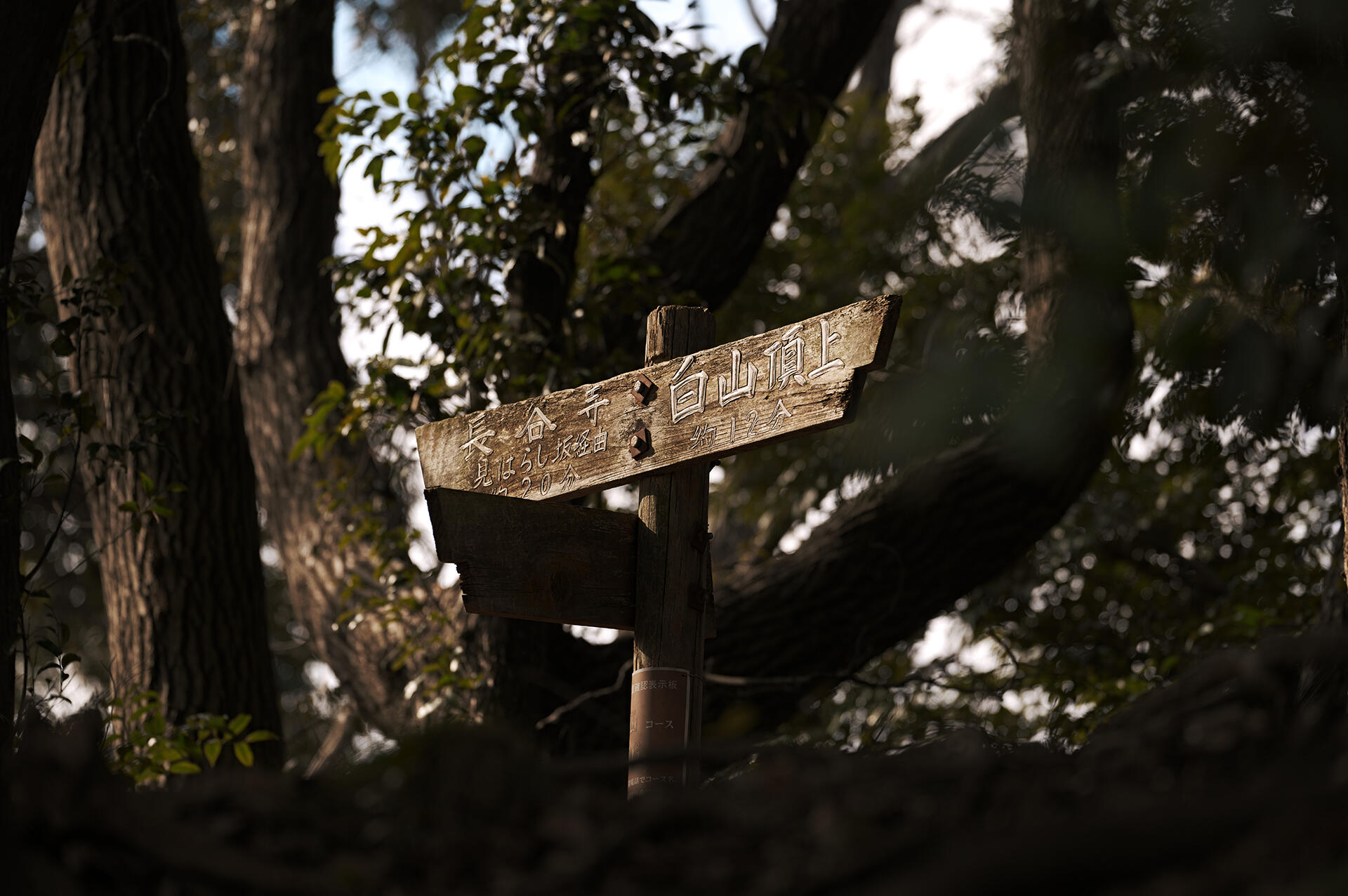 女坂を下り始めて見上げると道標が陽光に光っていた。