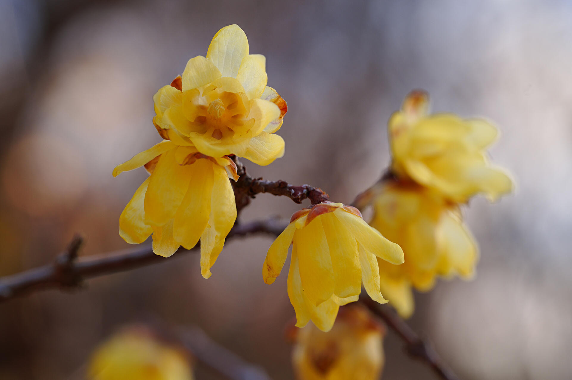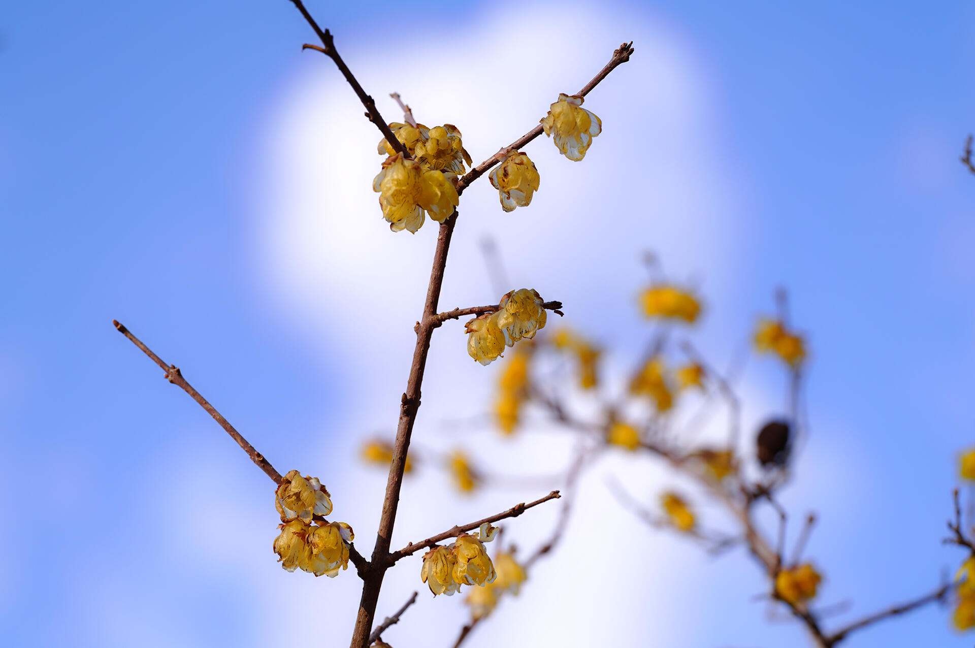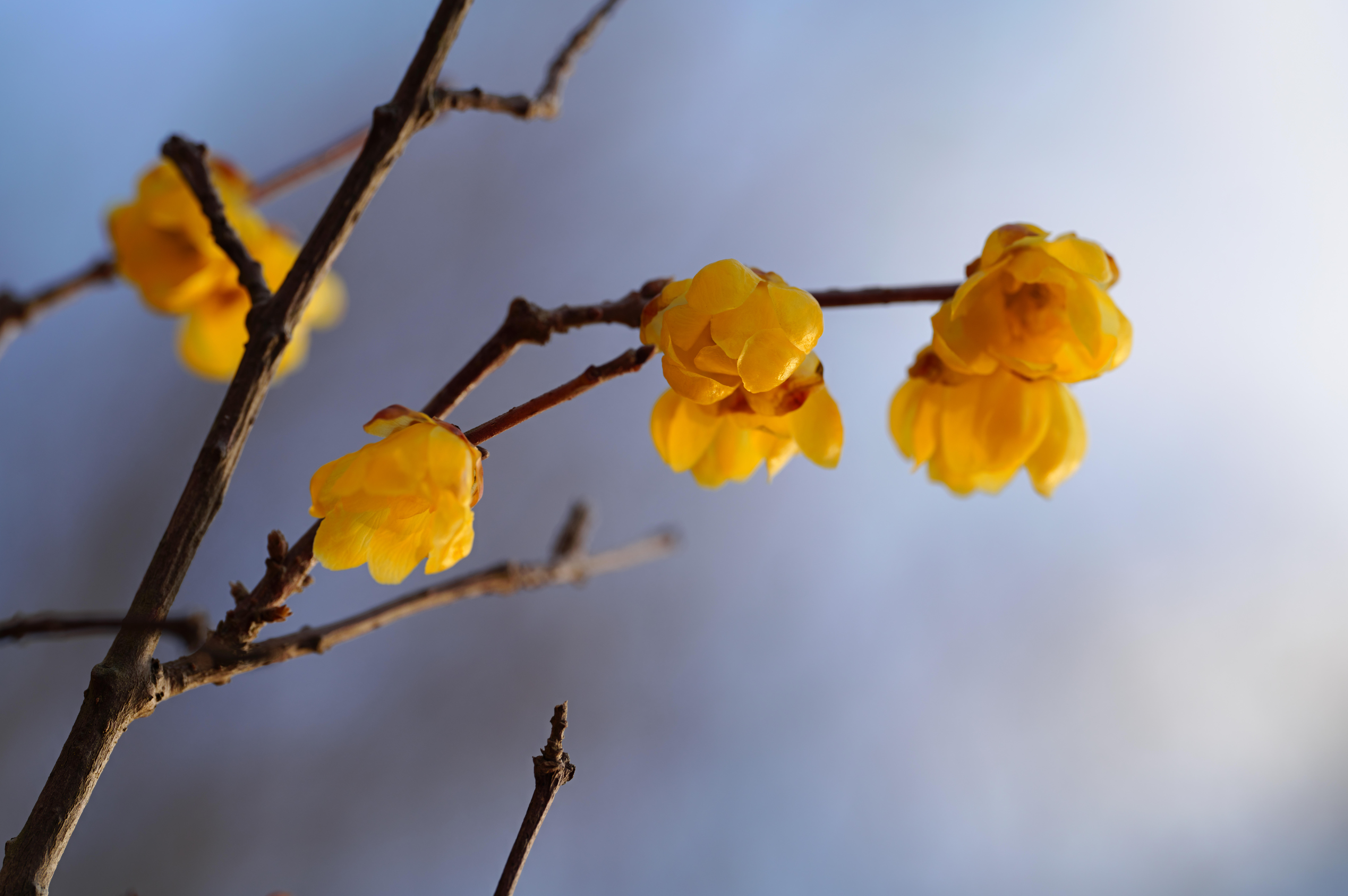 蝋梅は中国原産の落葉低木で、花が蝋細工のようなコーティングをしているように見えることから「蝋」という字が使われ、梅と同時期に開花するので「梅」という字が使われているとされるのが一般的な説だが、梅はバラ科で蝋梅はロウバイ科で全く別の植物。花言葉の「奥ゆかしさ」「慈しみ」「慈愛」は、うつむいて咲く花の様子に因み、「先導」や「先見」は、厳しい冬でもいち早く開花する特徴に由来する。