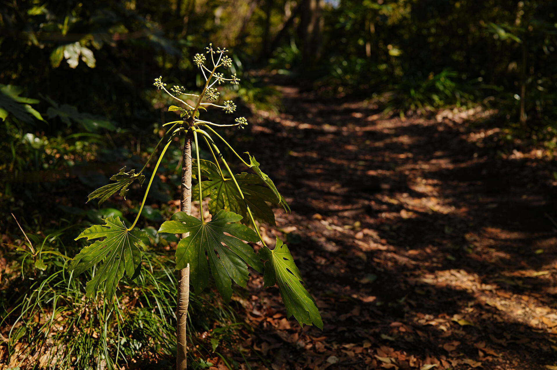 頂上に至る直前のトレイルは緩やかな上りで歩きやすい。三ヶ岡山緑地でよく見かけるヤツデにフォーカスし、木漏れ日が美しいトレイルを大きくぼかした。