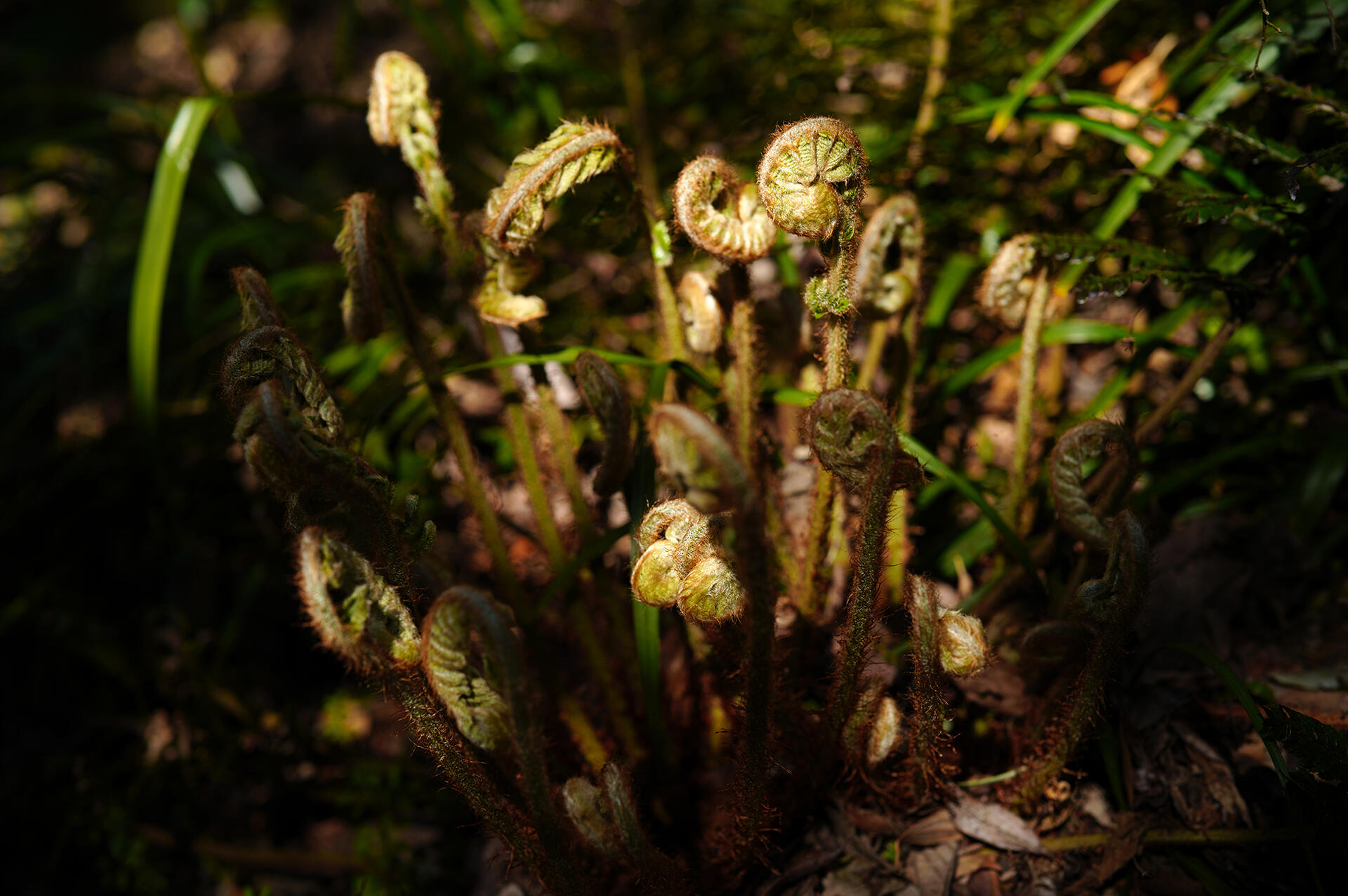 木漏れ日が美しいトレイル脇で見かけた芽吹いたシダ。マクロレンズのように寄って撮影してみた。