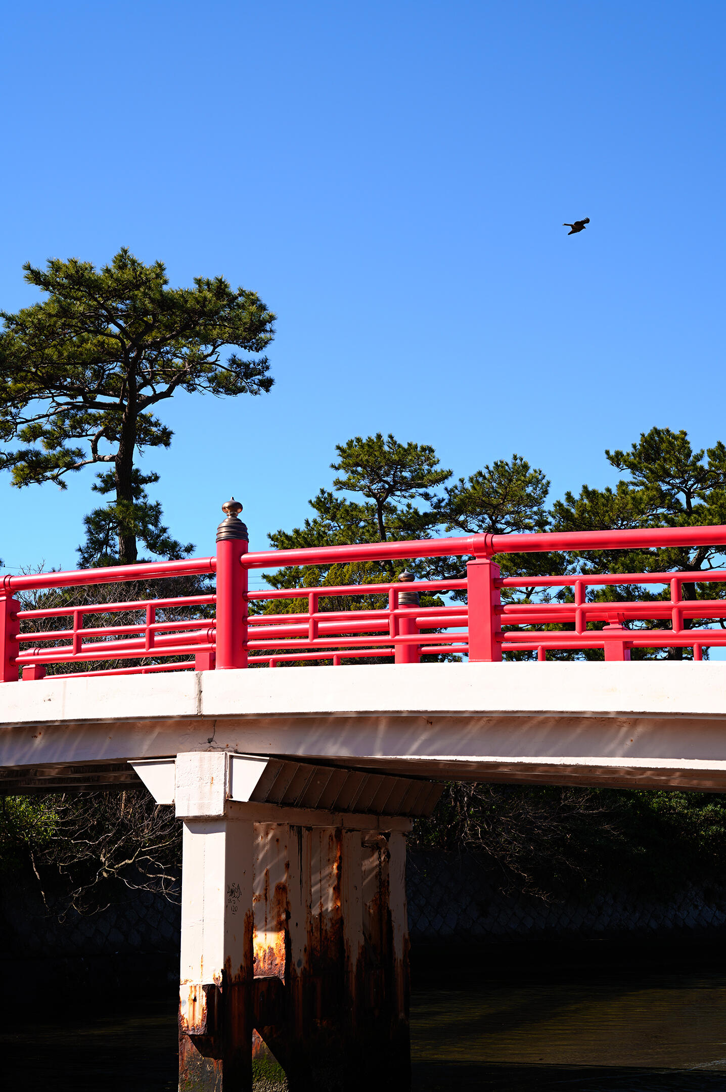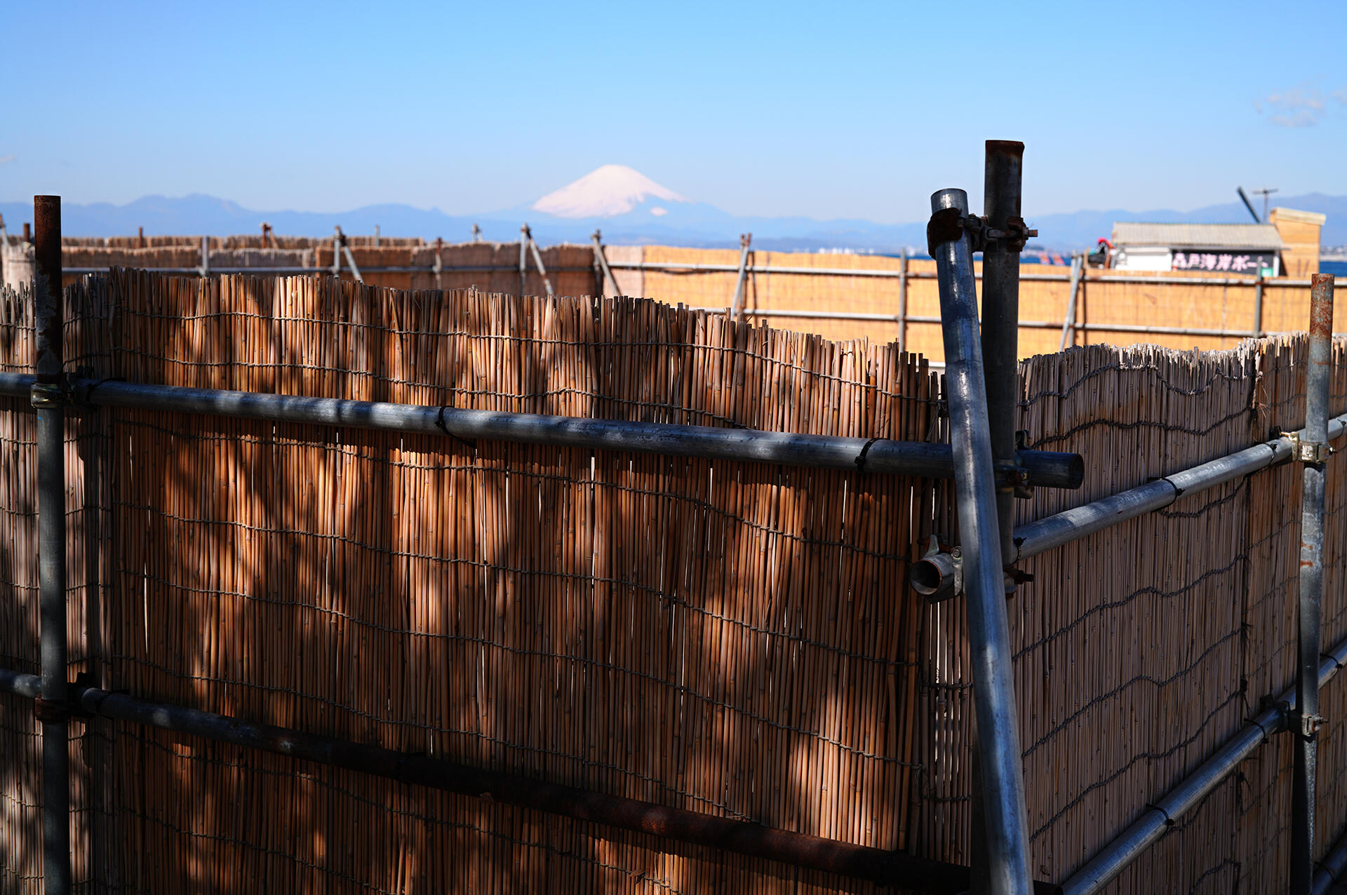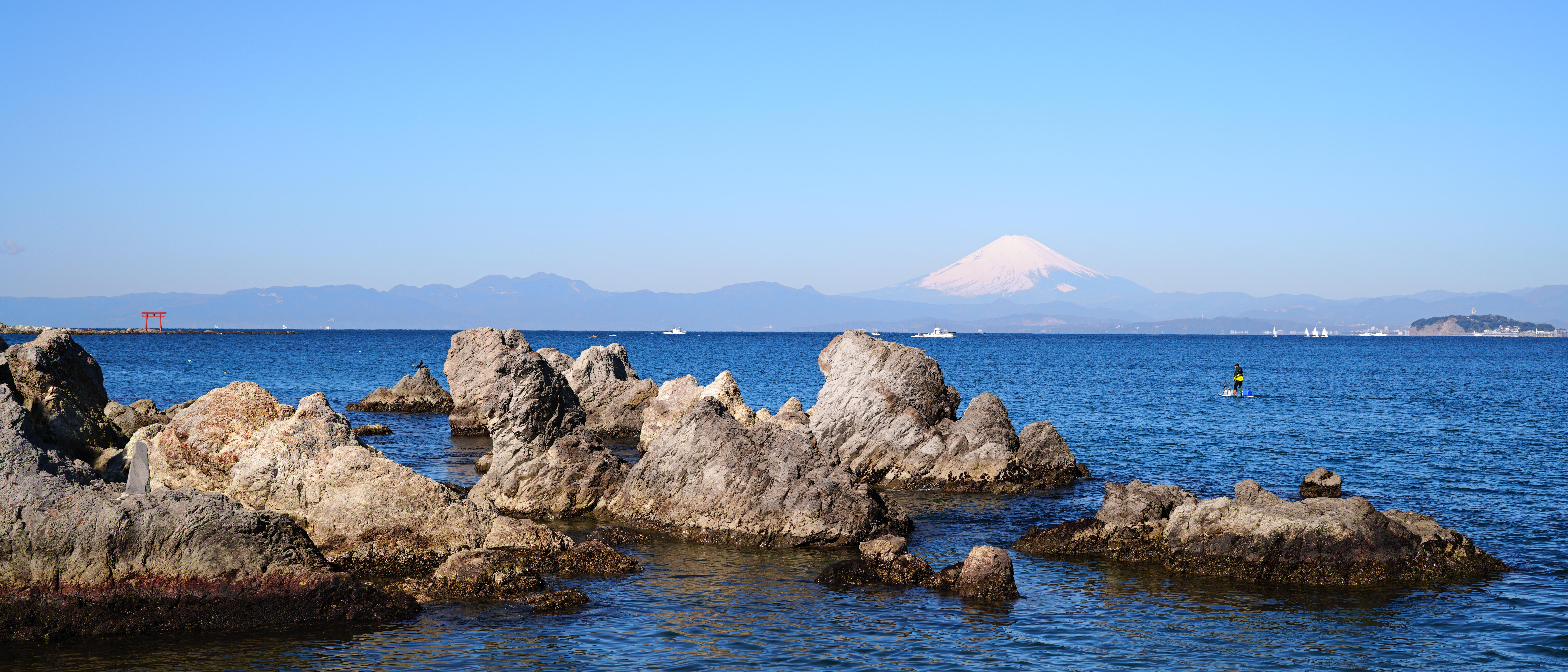 スカイブルーの空、コバルトブルーの海、白い雪を被った富士山。これ以上望めない快晴の朝、神奈川県三浦郡葉山町を流れる森戸川河口に造られた導流堤の上に立ち、相模湾に向かいカメラを構えた。写真には引き潮で大きく姿を現した岩礁が自然な形で写り、赤い名島の鳥居と江ノ島が50mmの画角の左右にしっかりと収まってくれた。