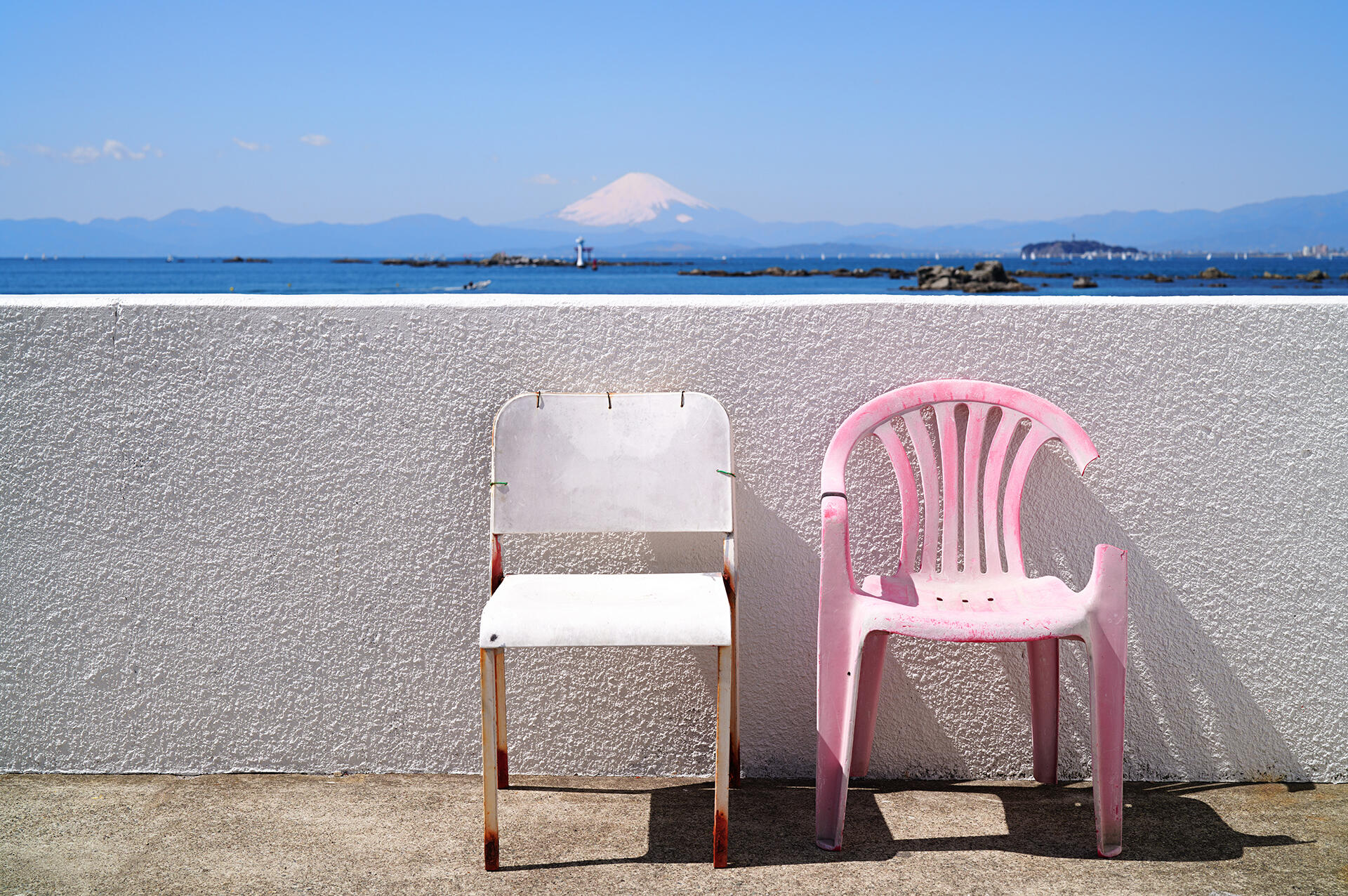 真名瀬バス停の裏にある小さなテラス。画面を整理し、古い壁前の古い椅子にフォーカスしたが、後方の海と富士山があってこその風景だった。