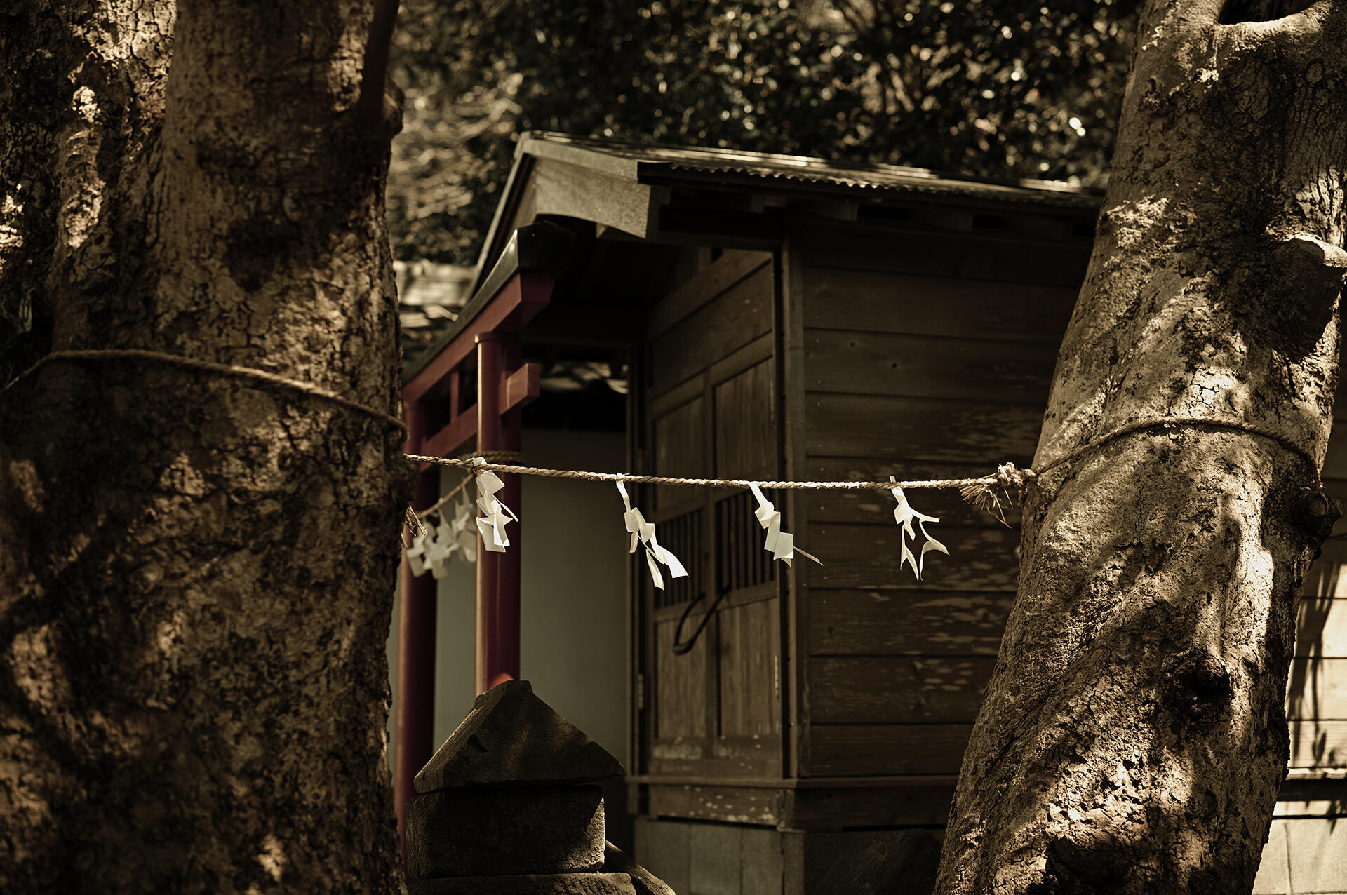 風に揺れる白い紙垂にフォーカスした。はやま三ヶ岡山緑地の真名瀬コース入り口付近に鎮座する熊野神社は、昔から地元の火防の神様として祀られている。このコースを登る際、必ず狭い境内を通ることになるので、参拝も日課となっている。