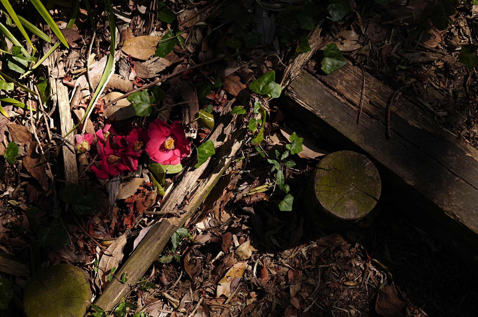 西の尾根コースが始まる西峰疎林広場までの階段は444段。その半分を登った辺りで見かけた椿の花は、木漏れ日に照らされ、落花になっても美しく見えた。