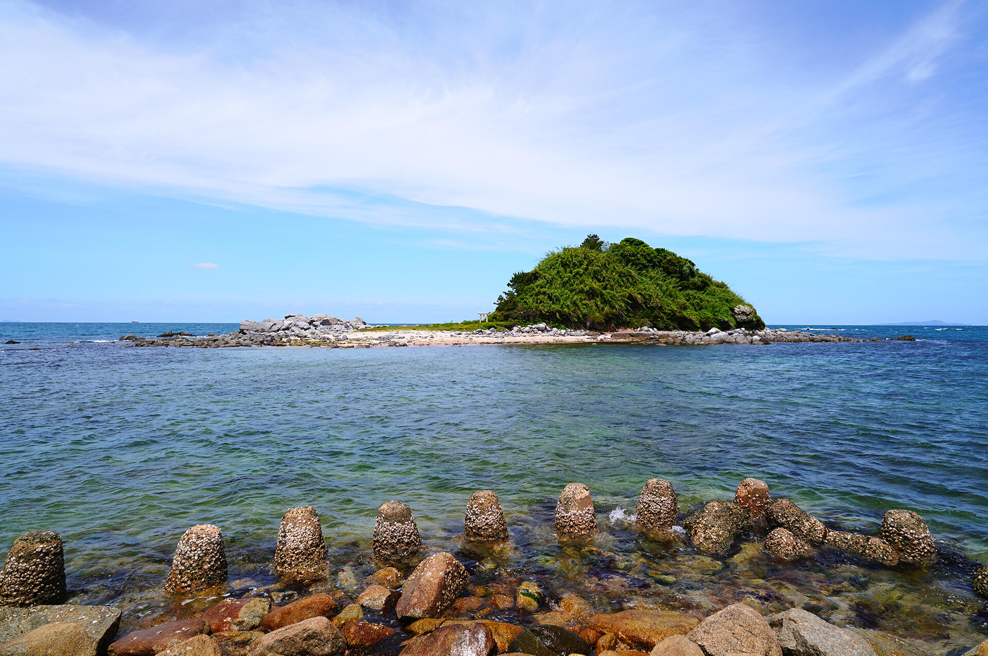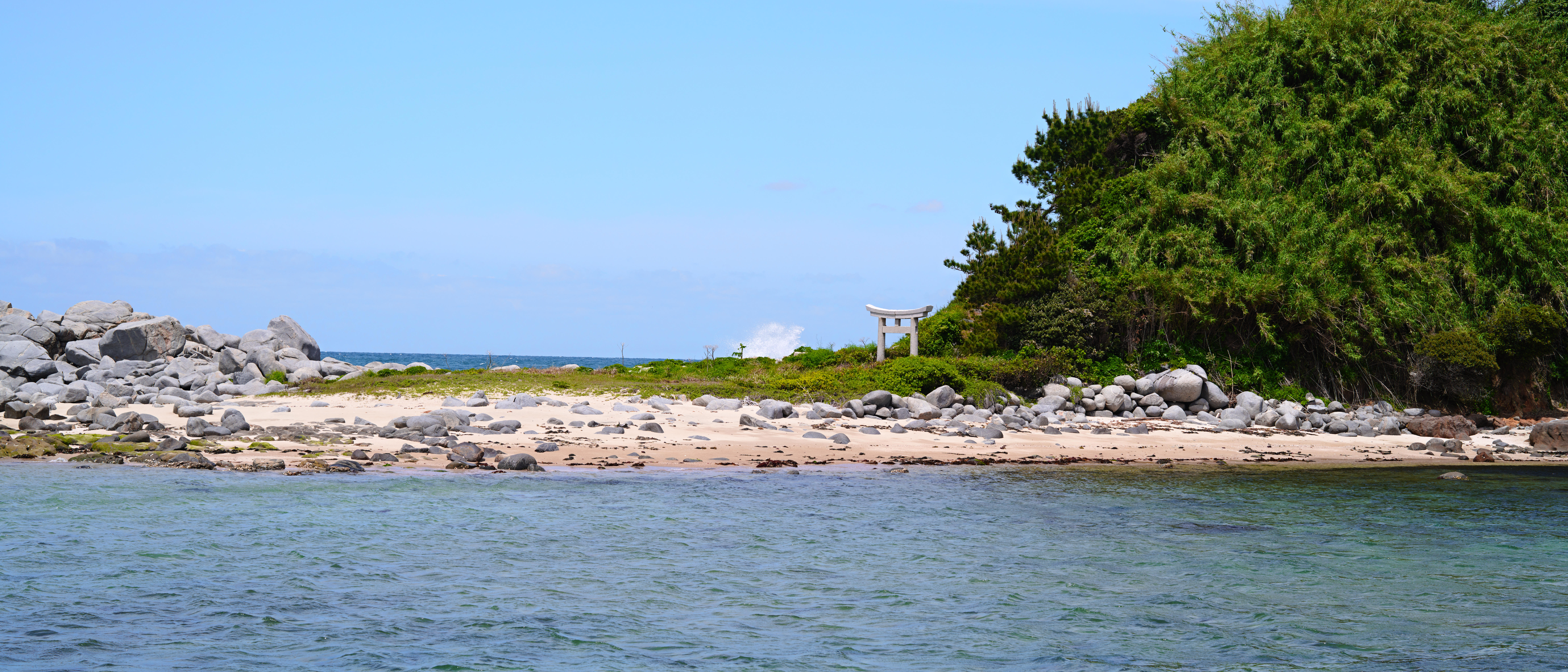 島の南東岸に位置する志賀海神社からは、志賀島の海岸部を一周する県道542号で北岸へ走り、ゴールデンウィーク中で賑わう休暇村前の駐車場に車を停めた。玄界灘に面した下馬ヶ浜へ出ると、海岸の北に小さな島が見えた。こんもりとした小高い山の様な島は、濃い緑に覆われ、白っぽい鳥居が島の低い部分に立ち、海岸を500mほど歩いて近づいてみた。