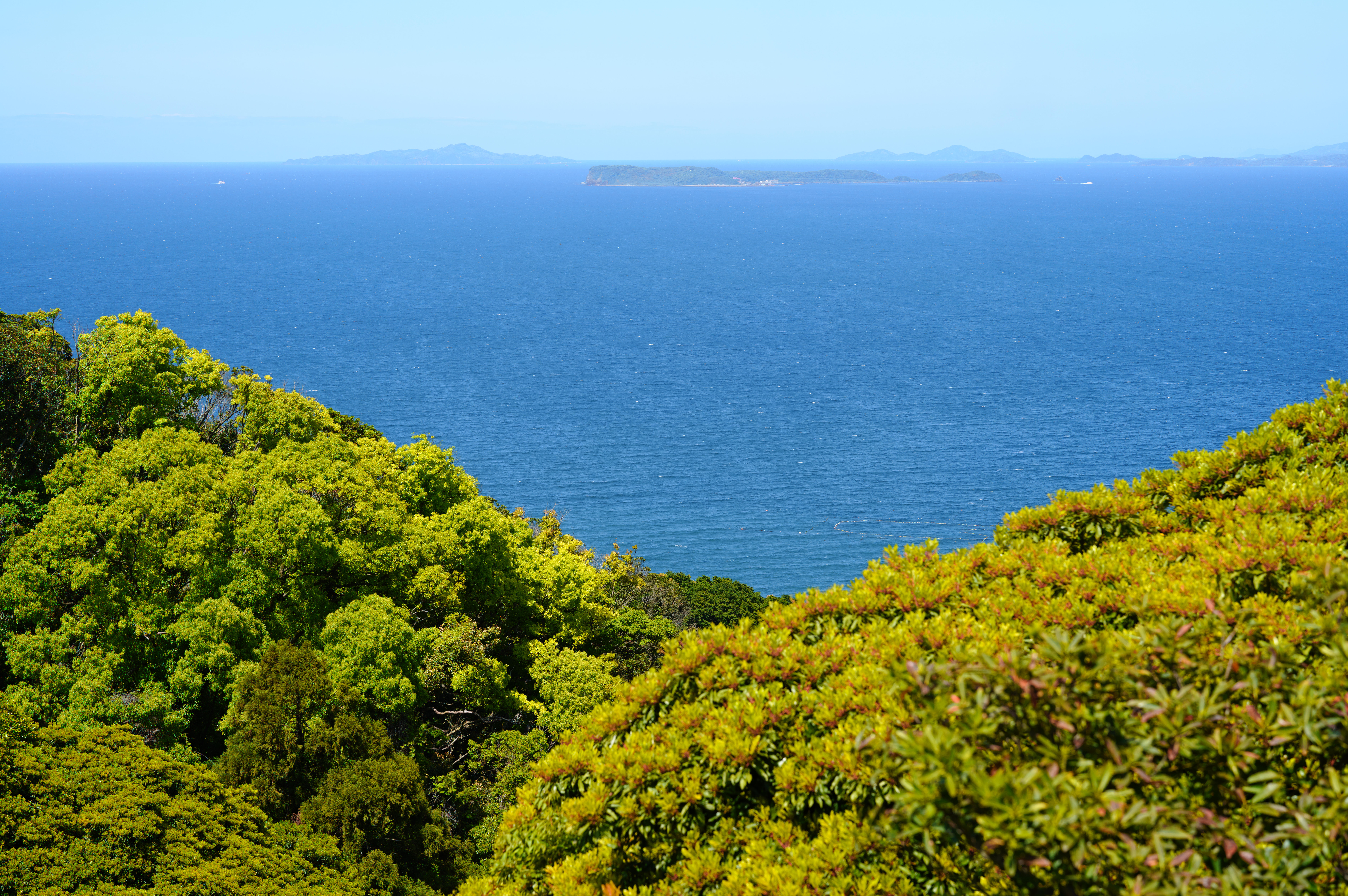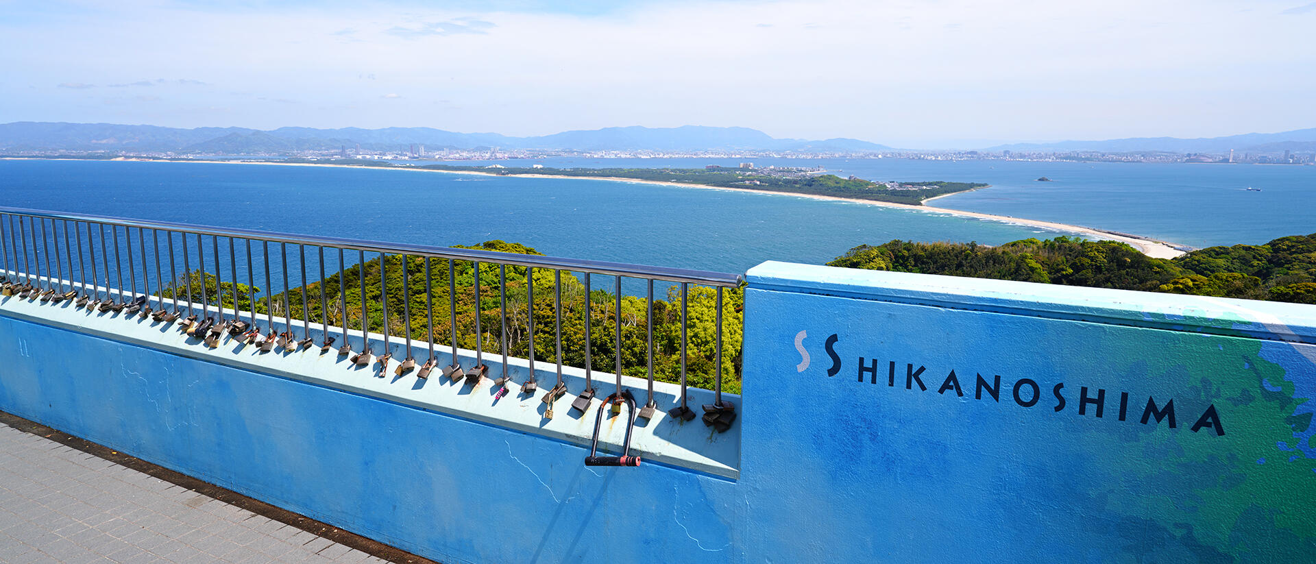 玄界灘、海の中道(うみのなかみち)、福岡湾、福岡市街までよく見えた。島の最高点である標高165mにある潮見公園の展望台からは、360度のパノラマが見渡せ、島に来たら必ず上りたい絶景ポイントだ。