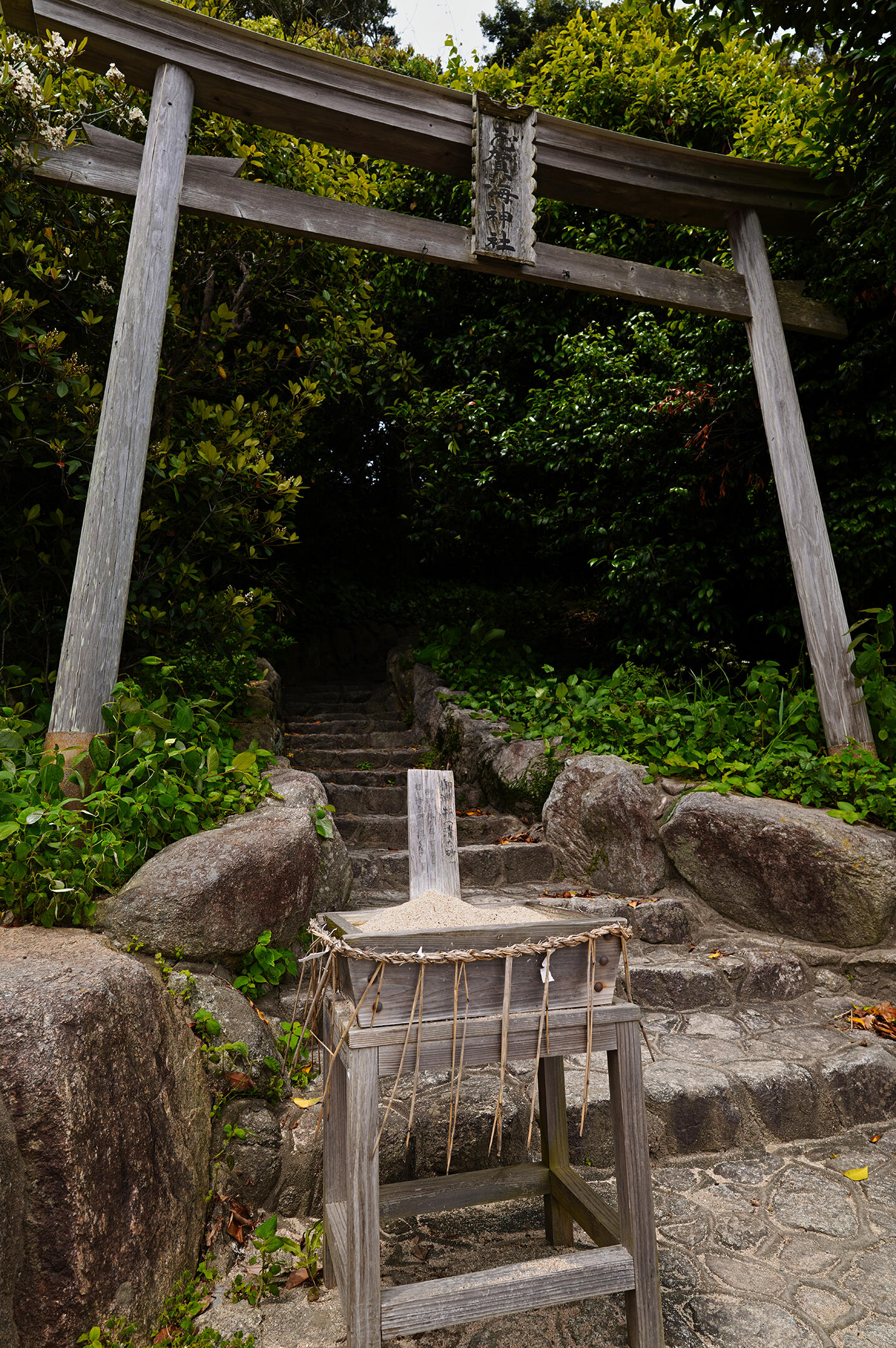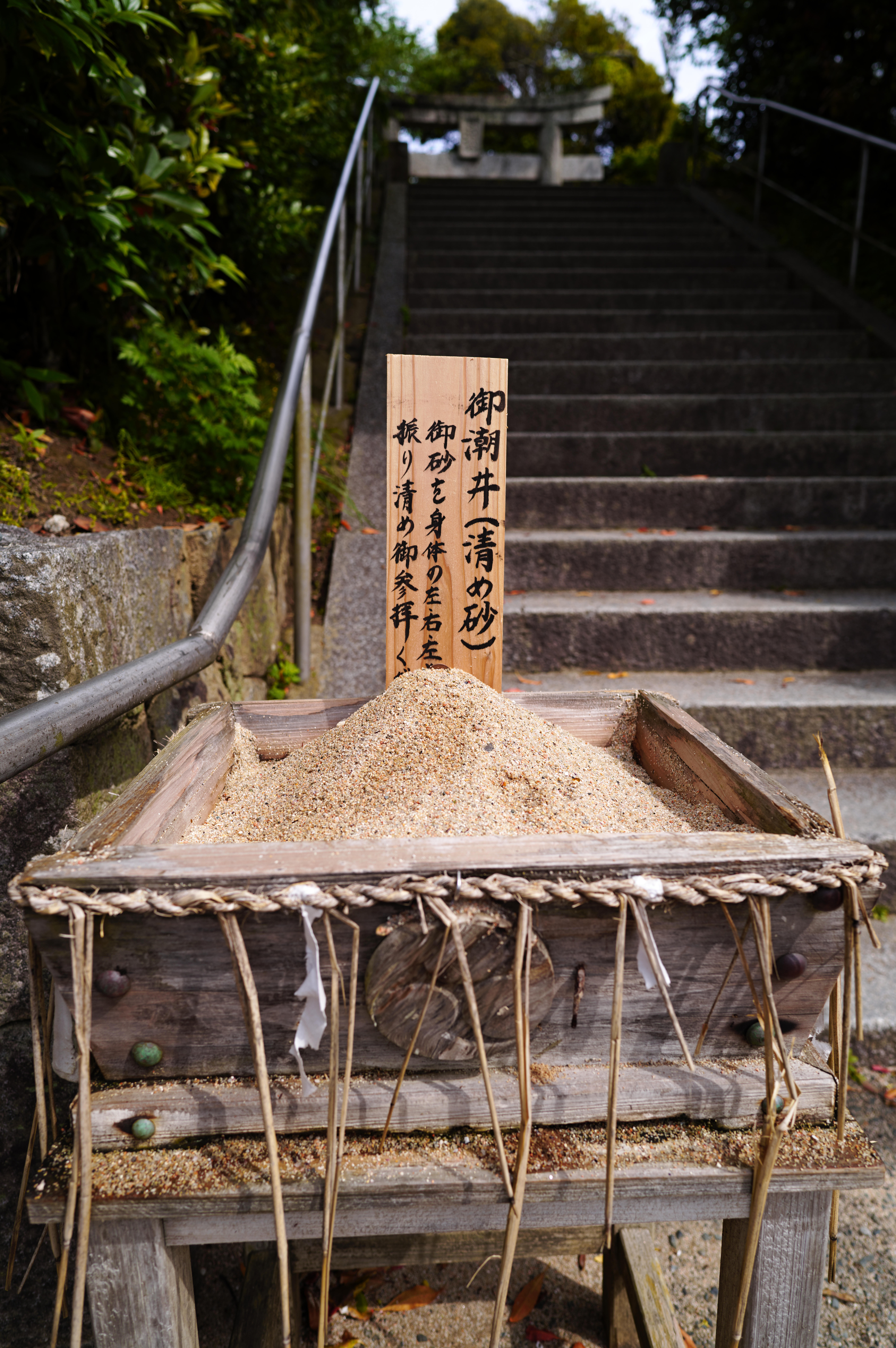 御潮井(おしおい)と呼ばれる清め砂が、境内へ上る石段前に置かれている。この砂で体を清め、まだ見ぬ境内に期待感を持って石段を登った。