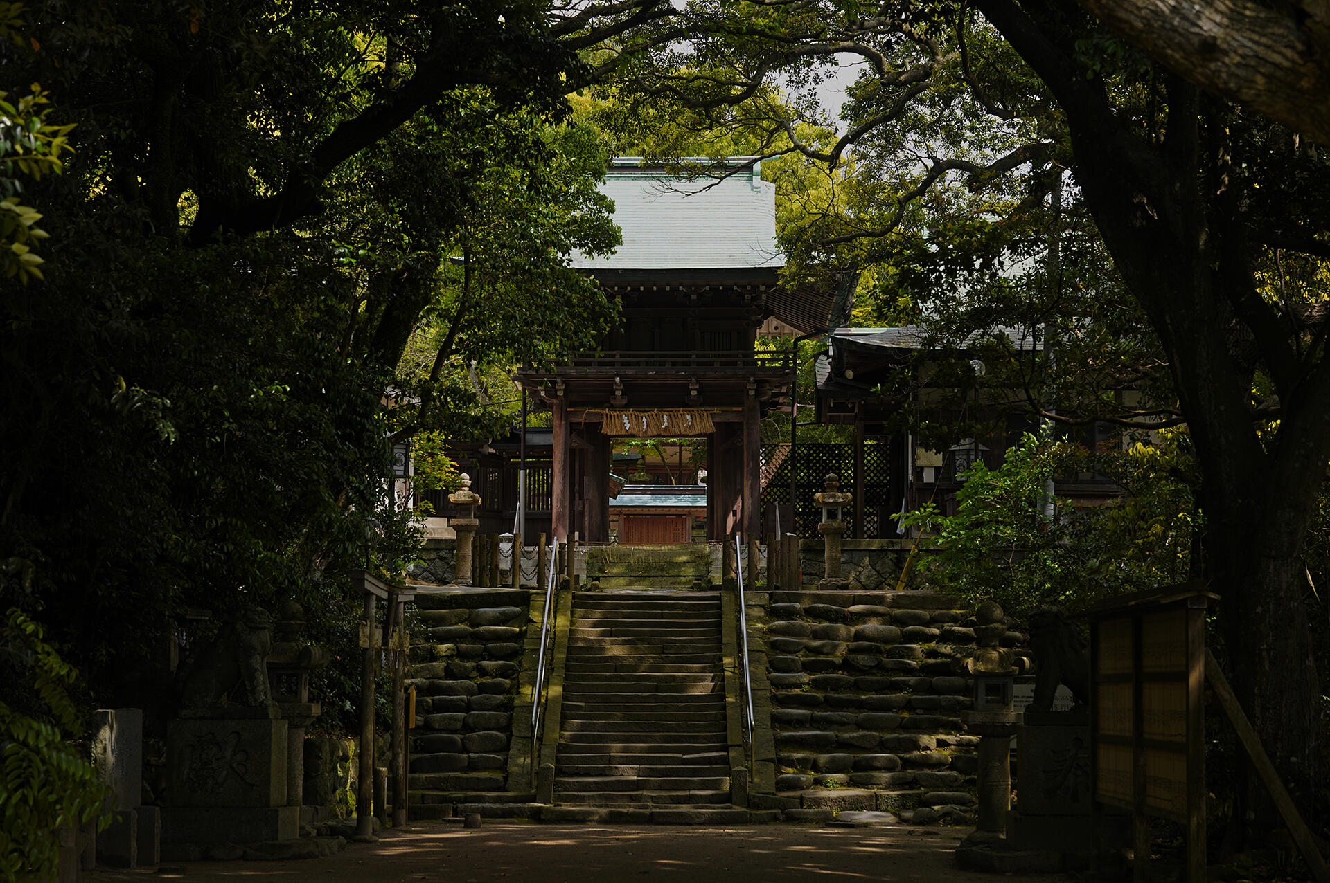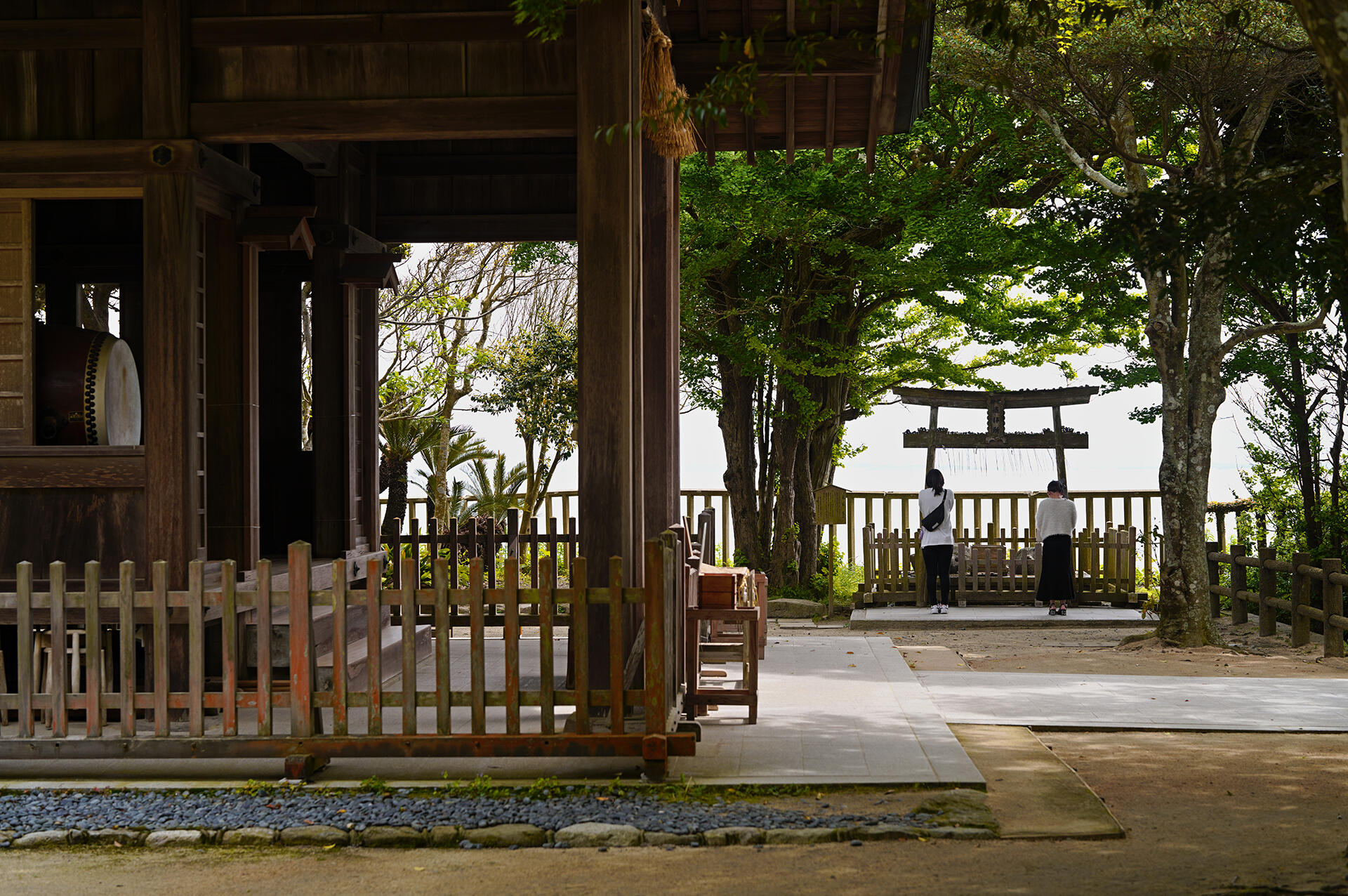 一直線に伸びた参道を行くと楼門が見えてくる。御祭神は、伊邪那岐命(いざなぎのみこと)の禊祓(みそぎはらえ)によって出現した海の底、中、表を守る海の主宰神である綿津見三神(わたつみさんしん)。志賀海神社は、綿津見三神を祀る全国の綿津見神社の総本社で、4月と11月の例祭において「君が代」の神楽が奉納される珍しい神社だ。