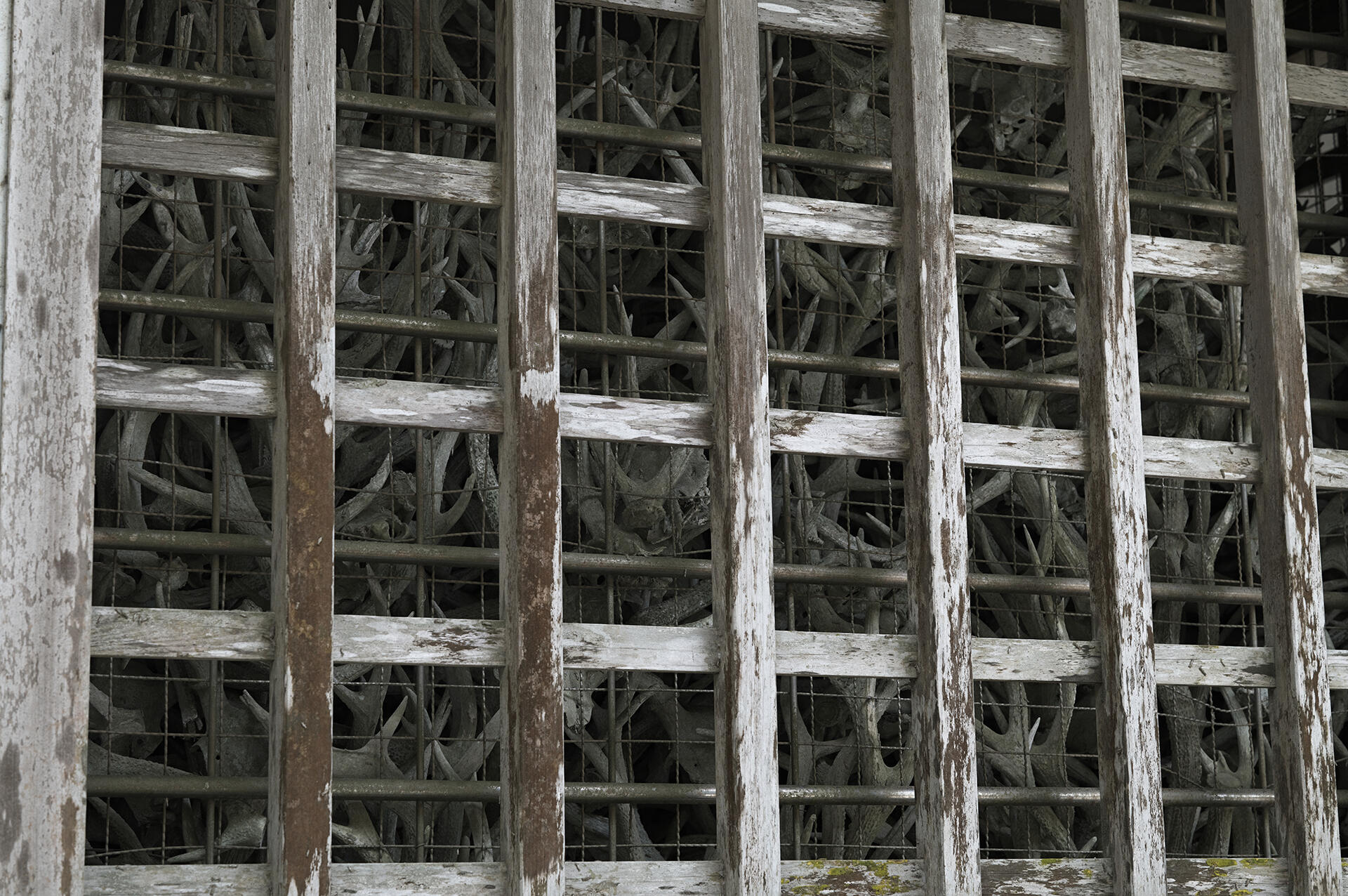 神功皇后が三韓出兵のときに対馬で鹿狩りをして、そのシカの角を奉納したことがはじまりとされ、その後は武将や権力者が奉納し、今では1万頭分の鹿の角が奉納されている鹿角堂「しかつのどう」。ぎっしりと詰め込まれた鹿の角は、物言わず色もなかったが、まだ丈夫で硬そうだった。
