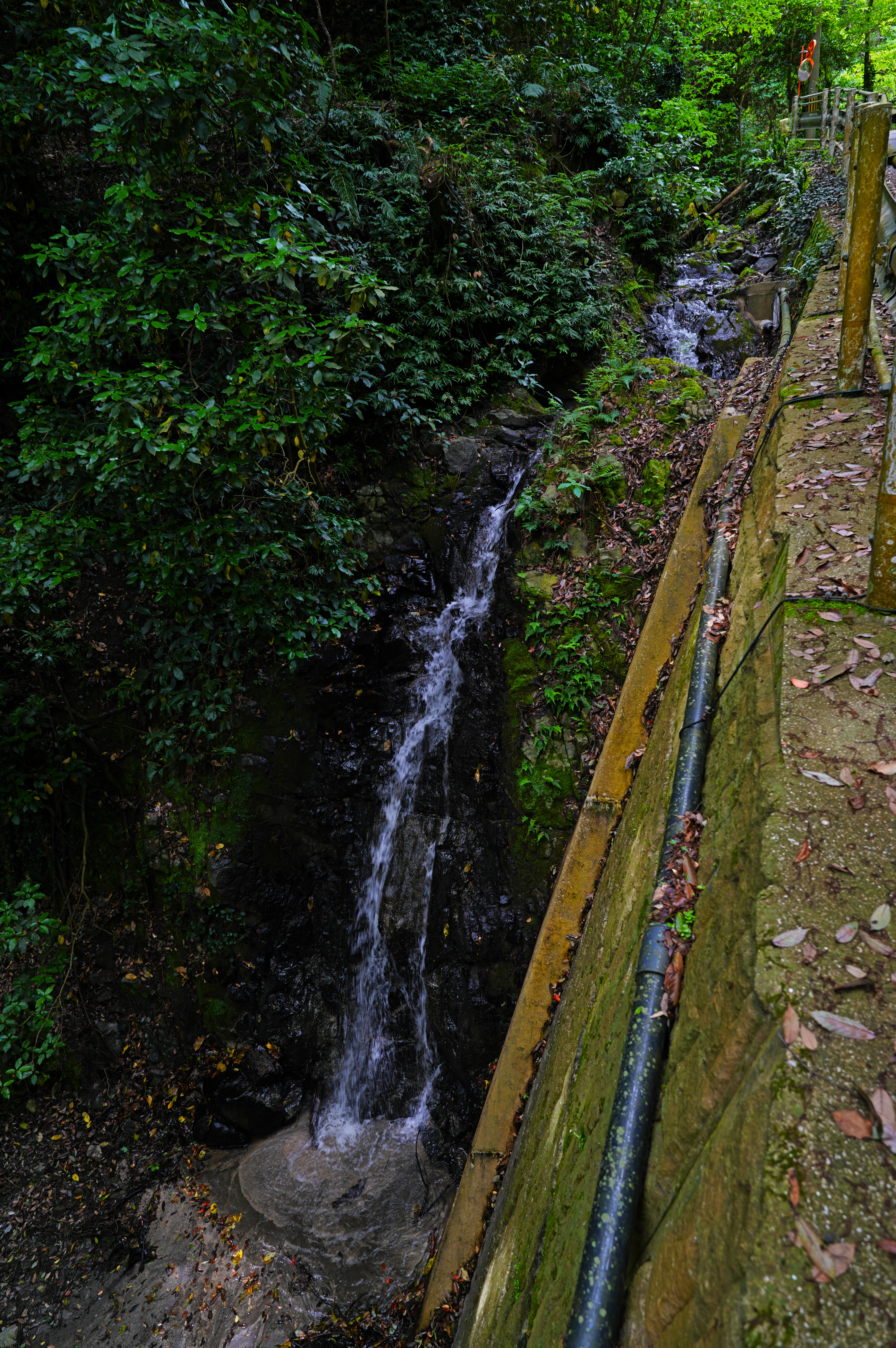 私が境内に上がった頃から参拝者が増え、境内で写真を撮るのは早めに切り上げた。境内の西端にあるトイレを借りてから何気なく下を見ると、高台にある境内から小さな滝が下に見えたので、石段を下り、境内の西側に流れる川沿いの道を上ってみた。