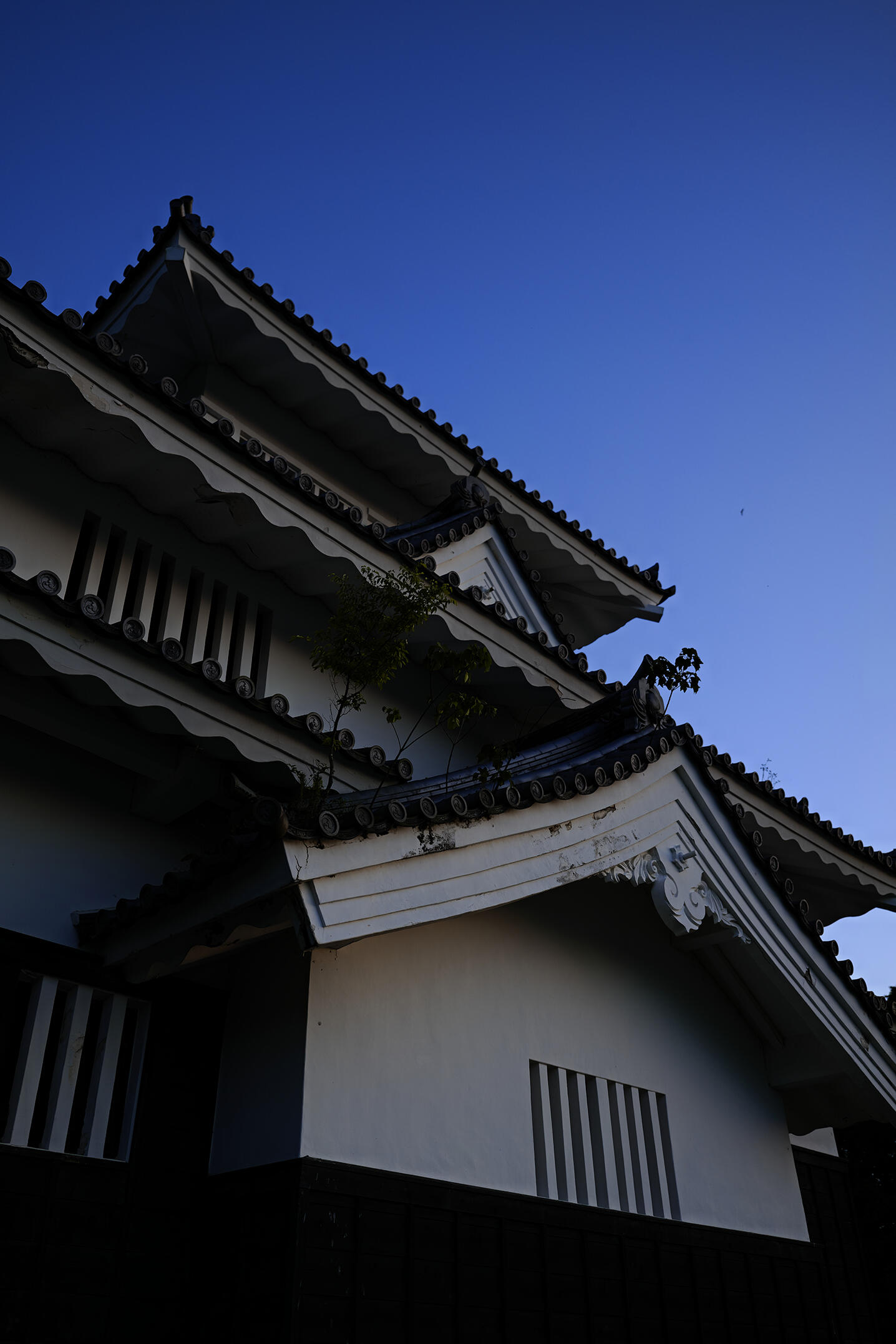 残照に浮かび上がる吉田城鉄櫓。こういうシーンで明るいレンズは