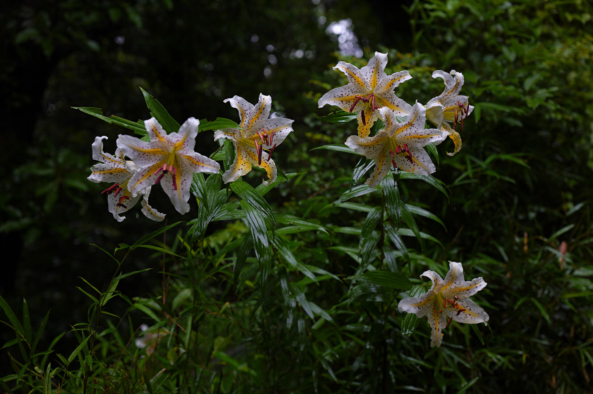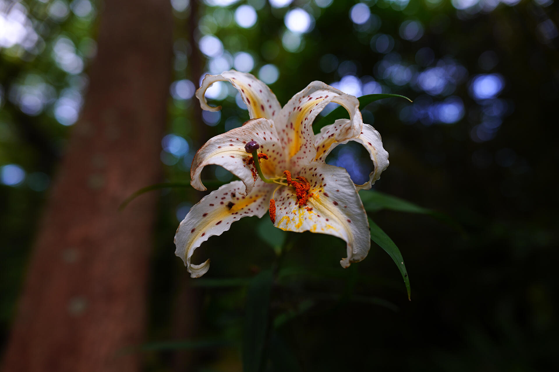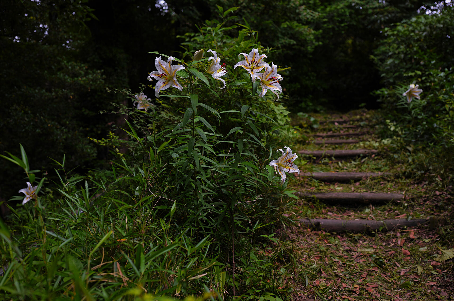 この日の夕方は、空は雲に覆われ湿気が高く森も暗かったが、トレイルを登って最初に出会ったヤマユリの花は瑞々しく、重苦しい空気を吹き飛ばしてくれた。地面から50cmほどの高さに咲いた花を見上げて開放F値で撮影した写真は、大きく美しいボケ味が得られ、高い位置に咲く花と蕾が森の中に溶け込んでいるように写った。