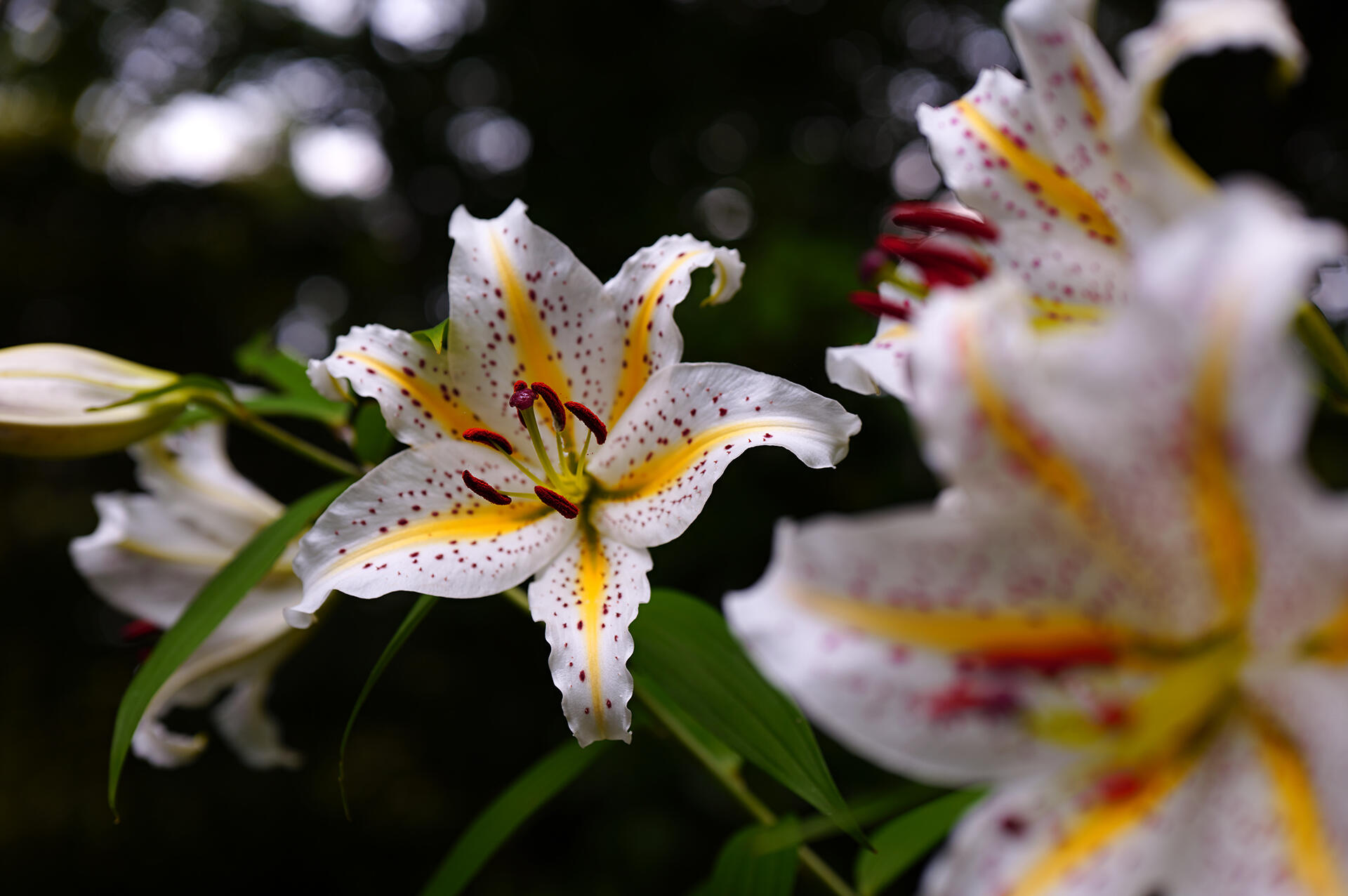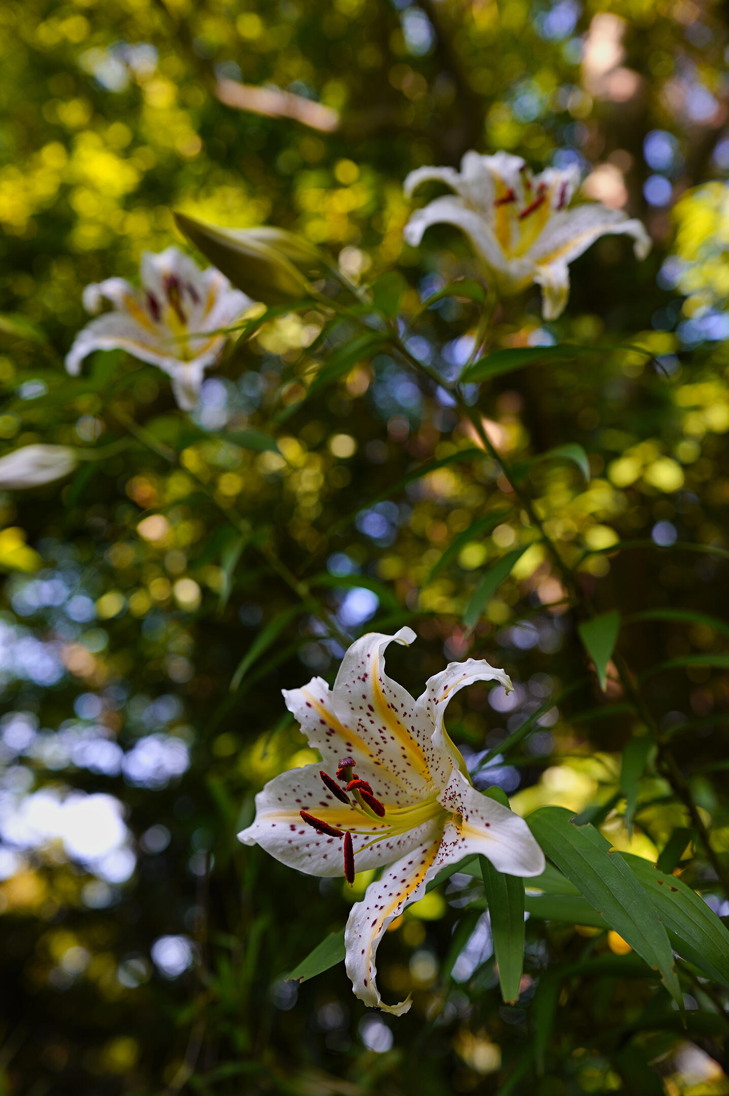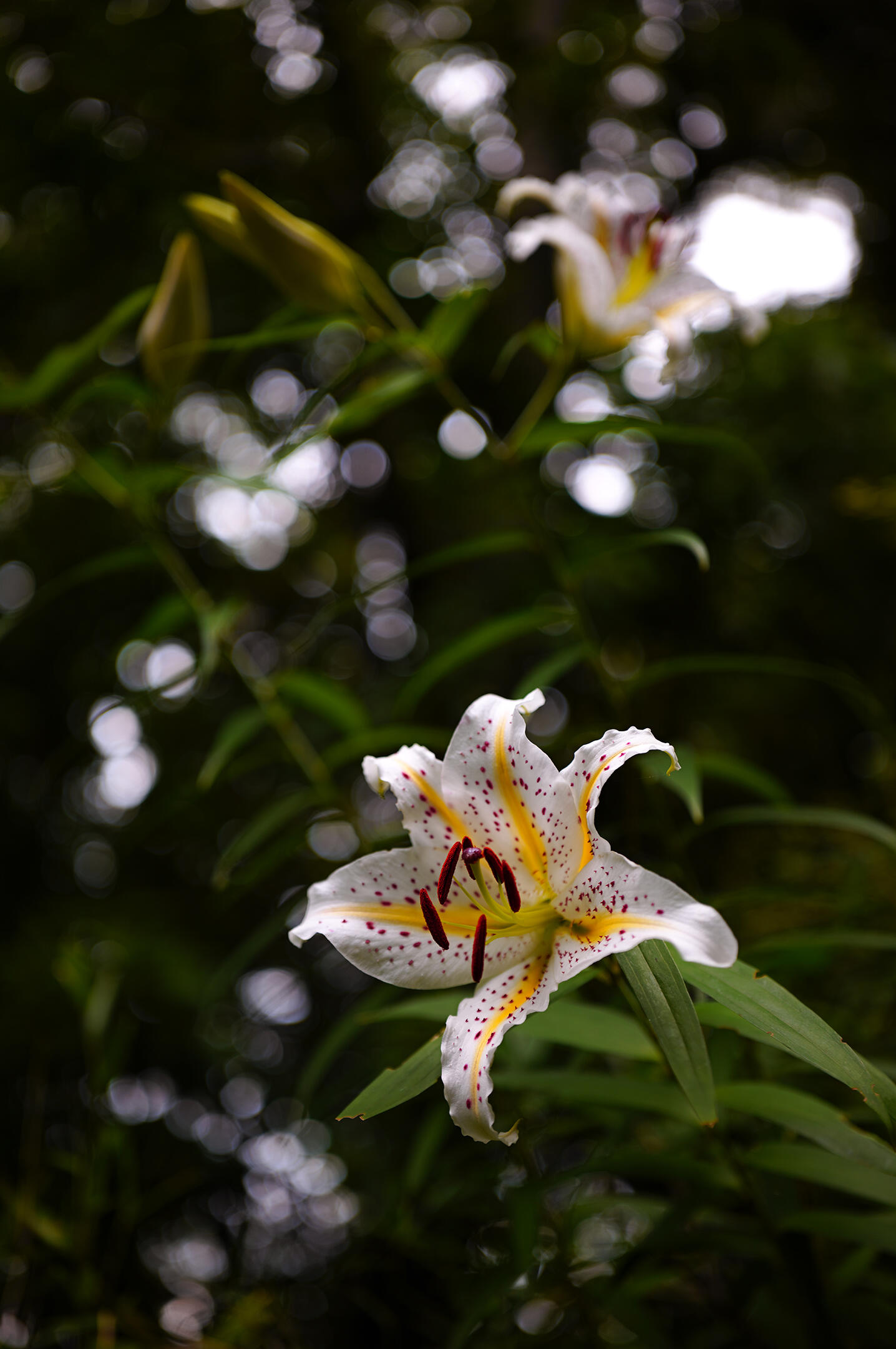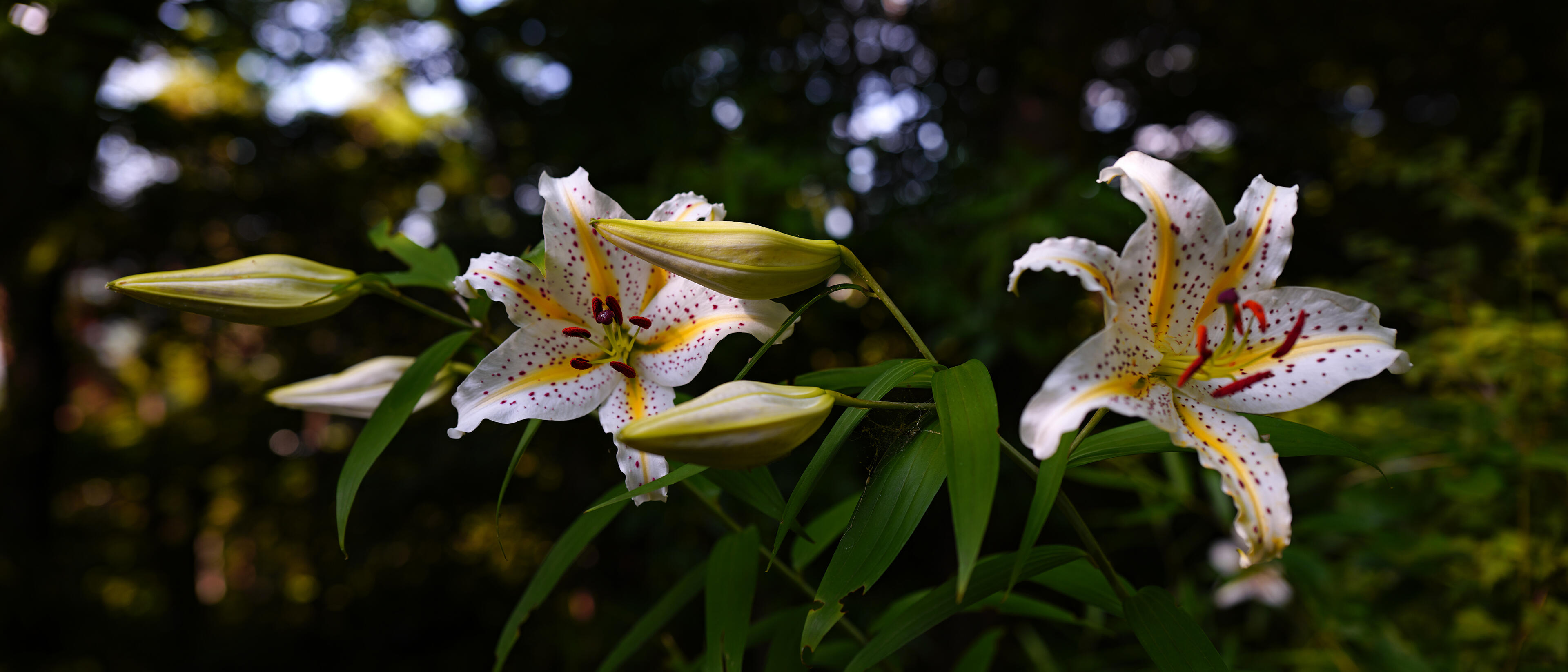 この日の夕方は、空は雲に覆われ湿気が高く森も暗かったが、トレイルを登って最初に出会ったヤマユリの花は瑞々しく、重苦しい空気を吹き飛ばしてくれた。地面から50cmほどの高さに咲いた花を見上げて開放F値で撮影した写真は、大きく美しいボケ味が得られ、高い位置に咲く花と蕾が森の中に溶け込んでいるように写った。